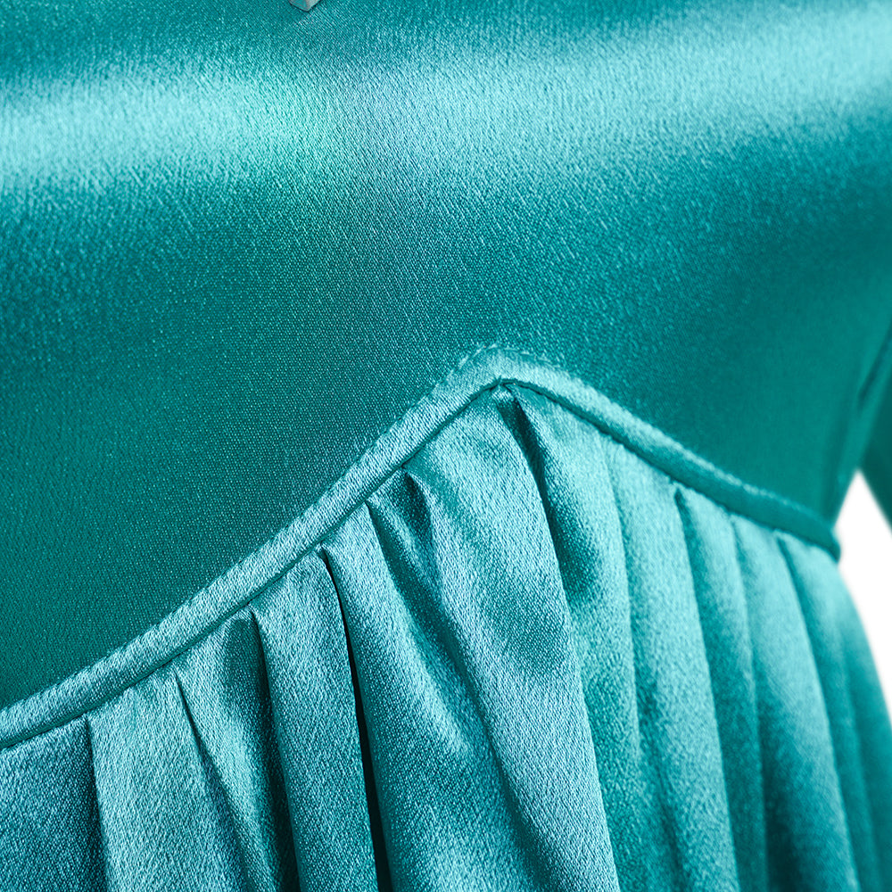 A: The dress is made of "5574 Green Crystal Satin," which corresponds to Rosalina's classic Mint Green / Turquoise Teal color seen in the game and movie.