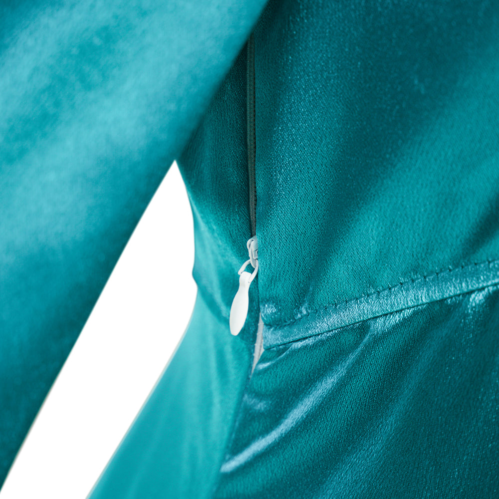 Unlike standard costumes, this dress is crafted from high-quality Crystal Satin (5574 Green & White), giving the fabric a beautiful, subtle shimmer that looks stunning under lights. The interior features a 75D Bright Double Crepe Lining, ensuring the dress is opaque, comfortable against the skin, and flows elegantly as you move.