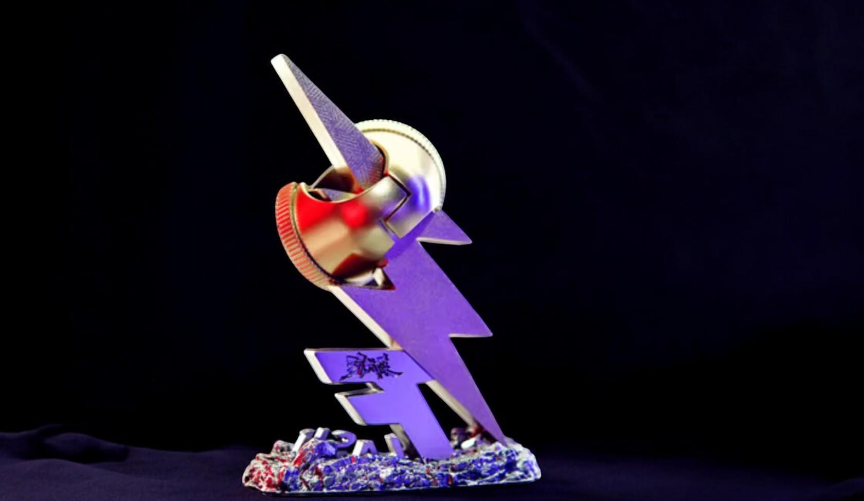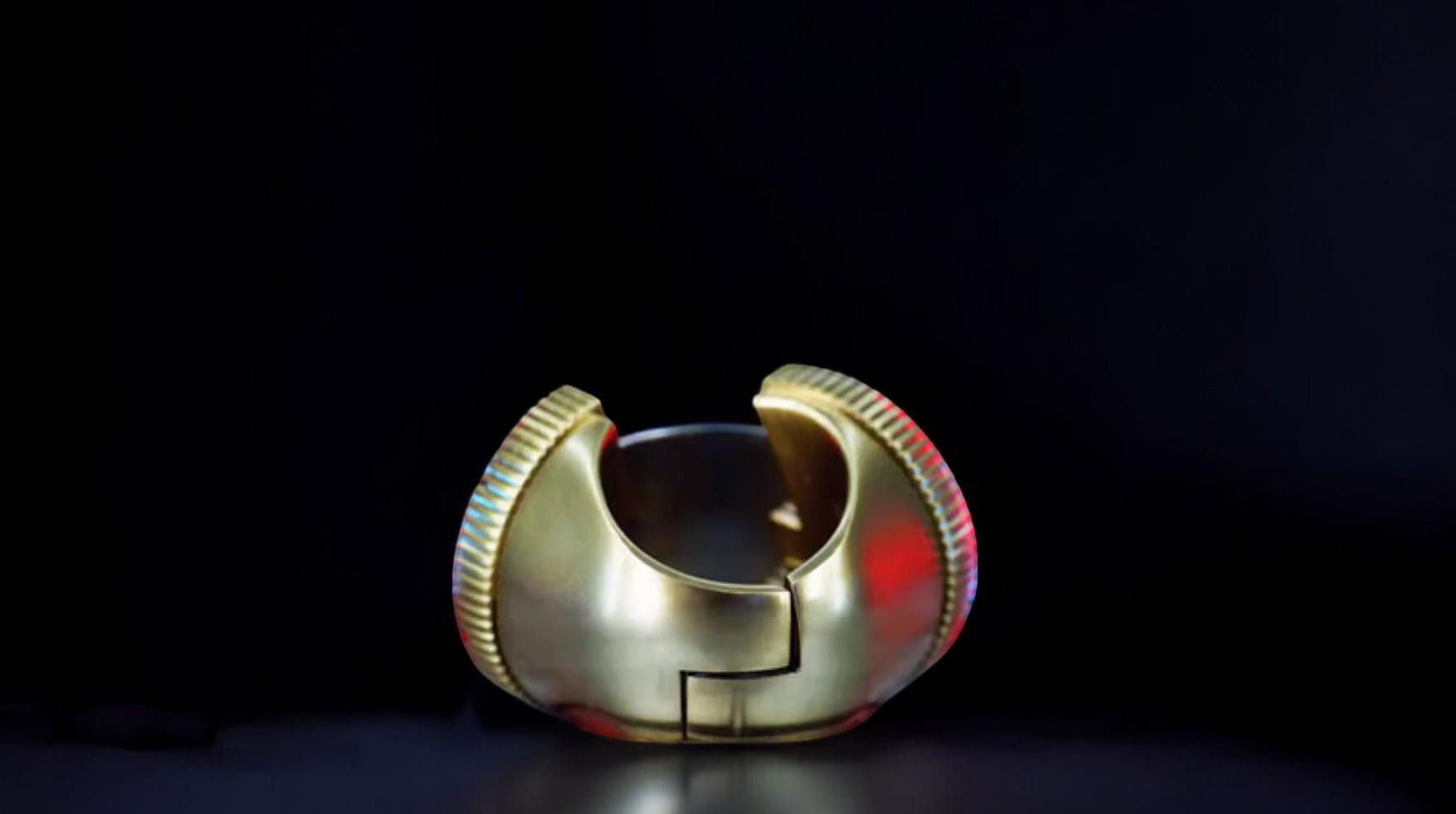 The gold band and red lightning bolt emblem are intricately engraved with vibrant, fade-resistant colors.