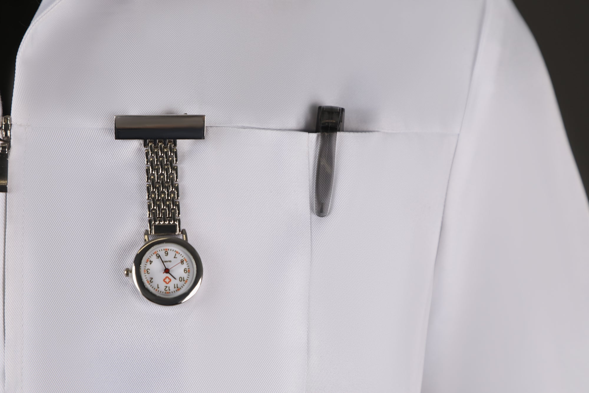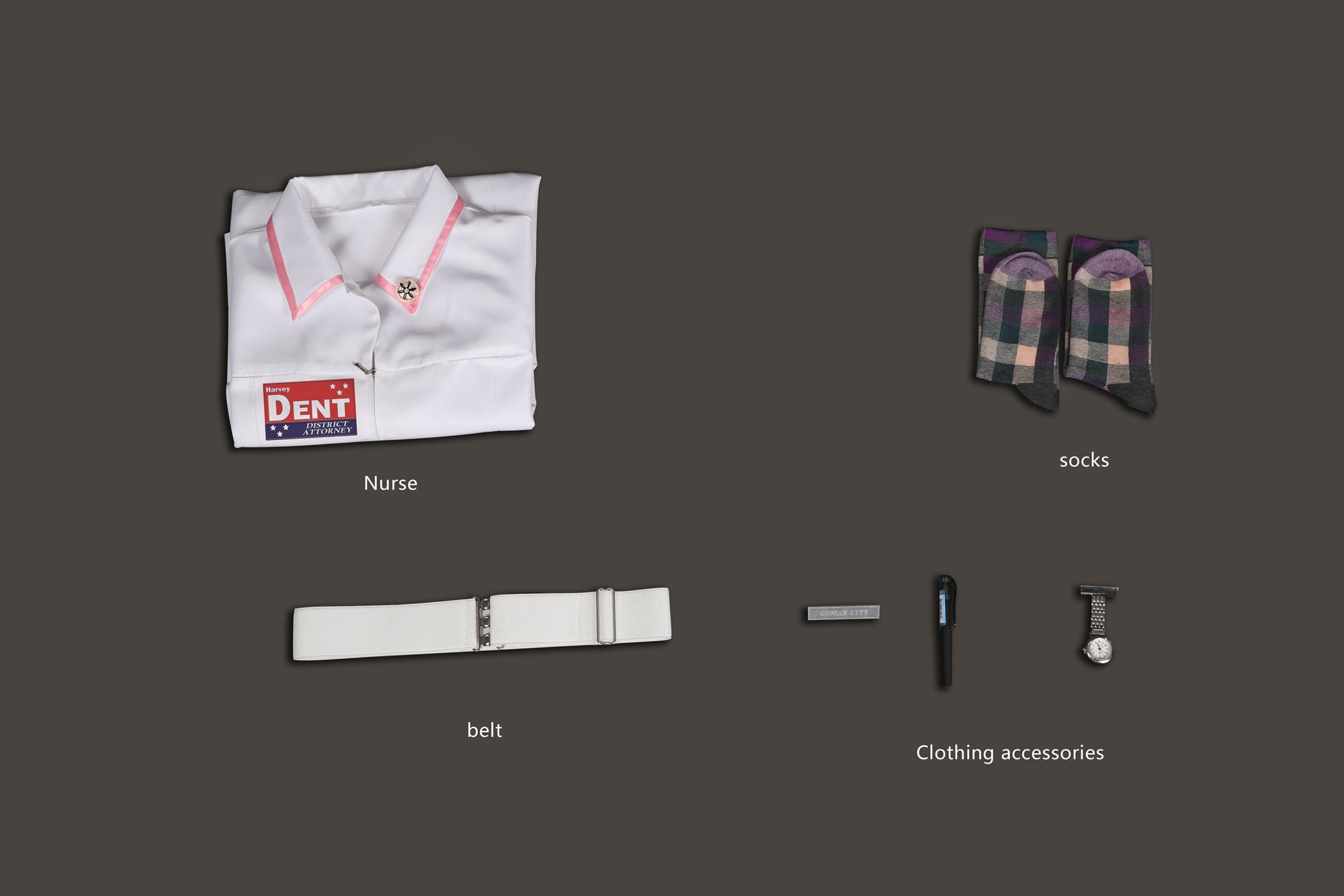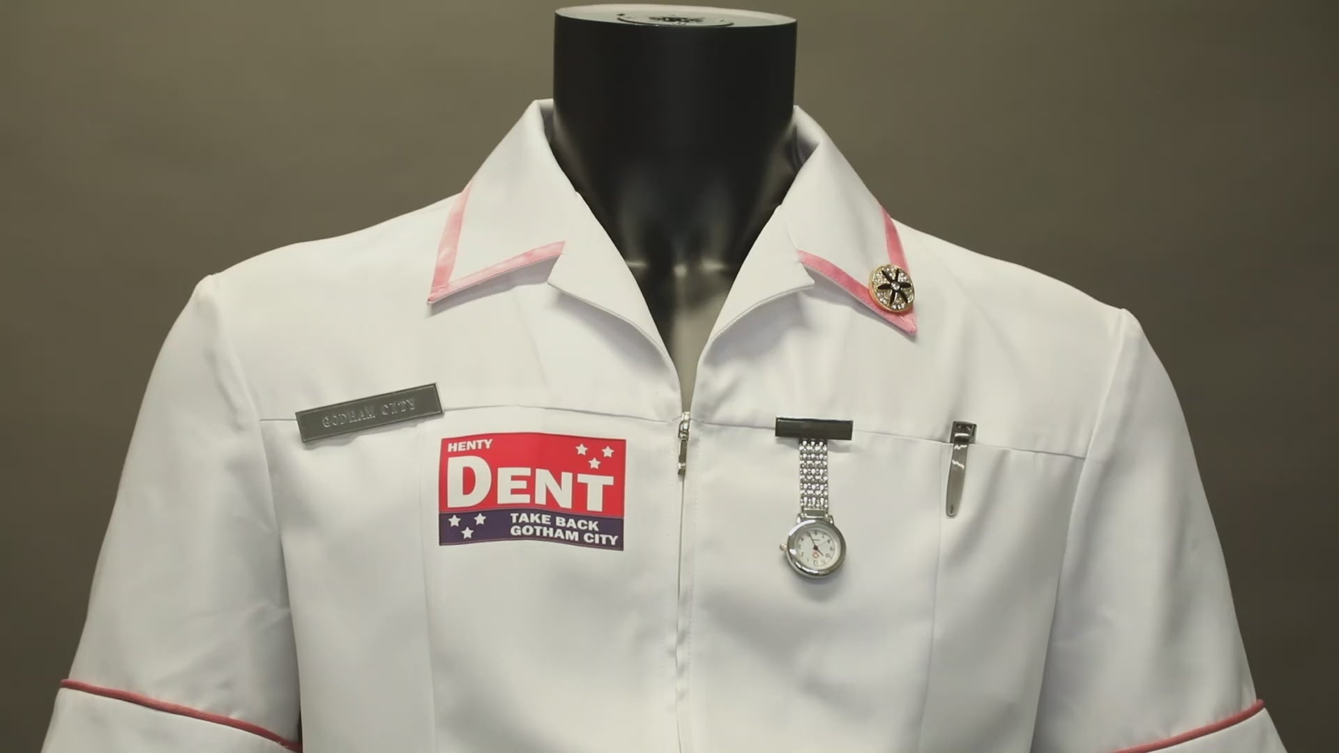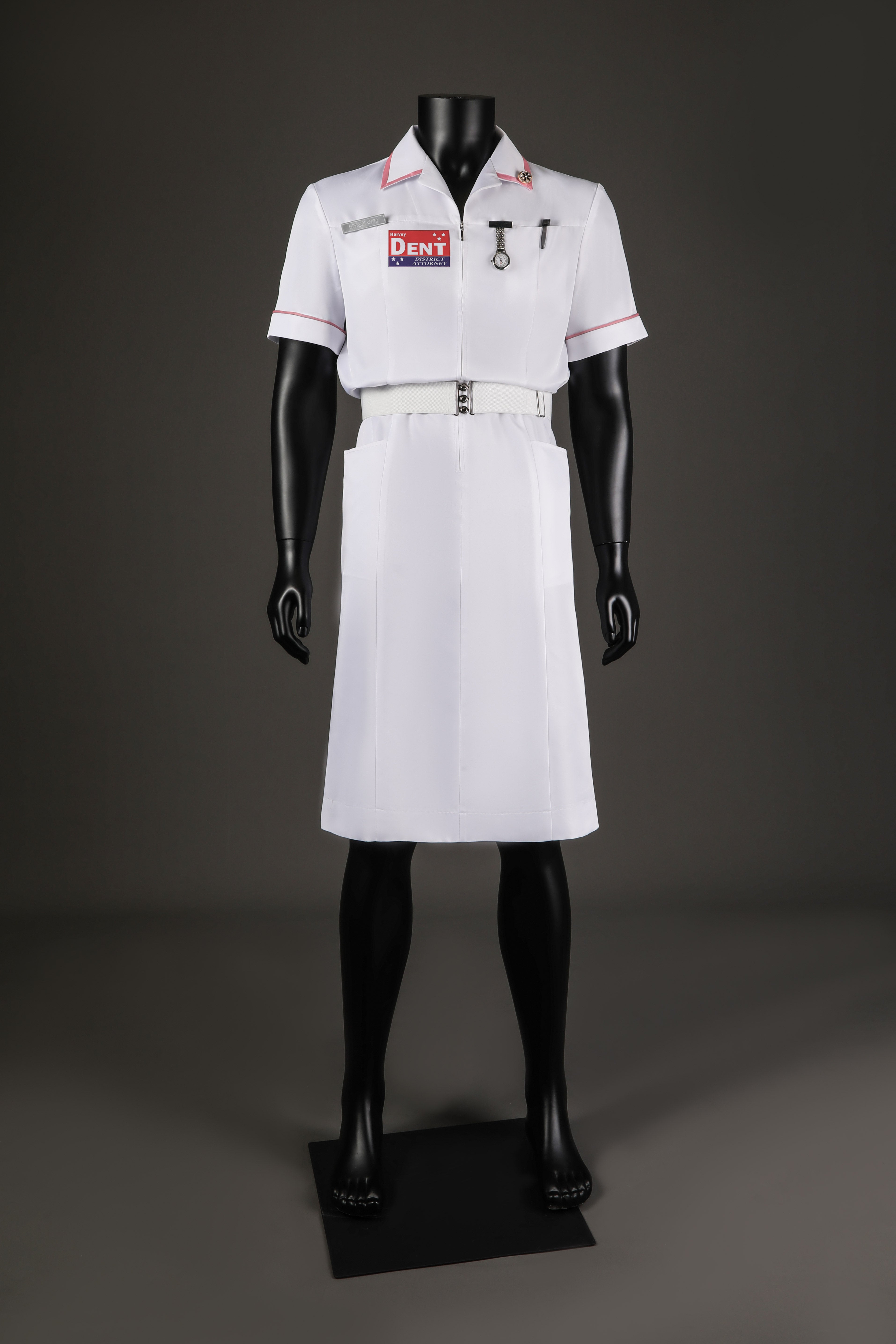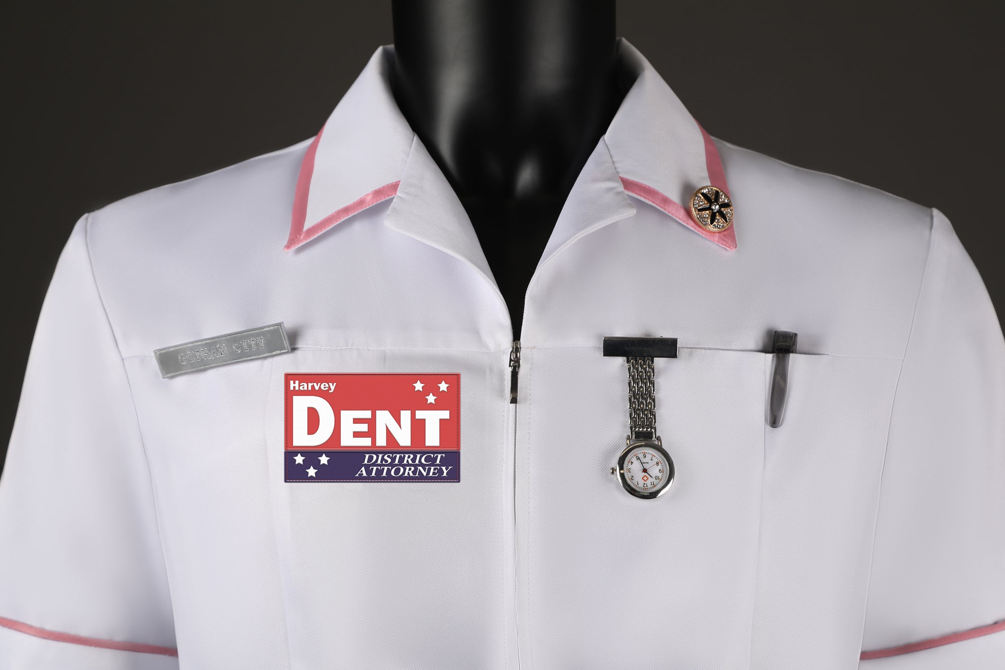 A: These are the small detail pieces attached to the uniform, such as the nurse badge or pins, designed to mimic the details seen in the movie scene.