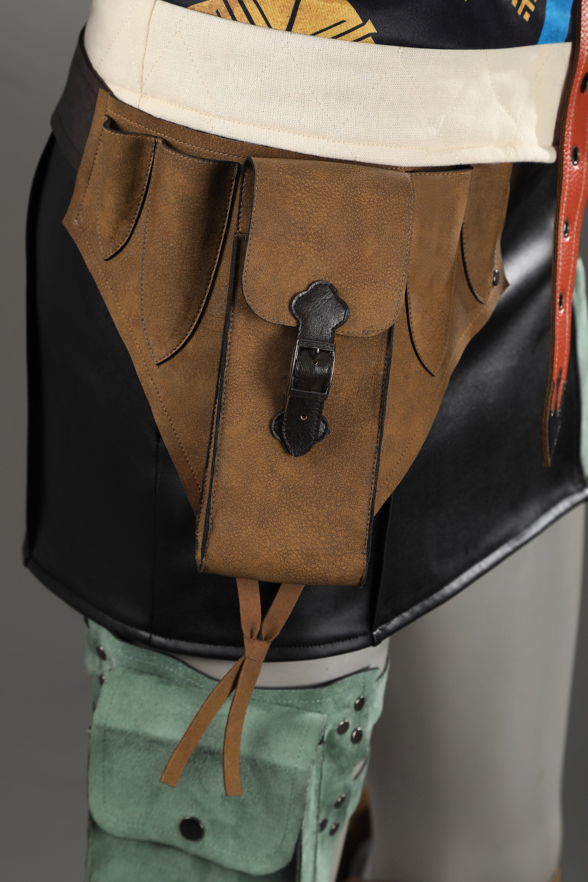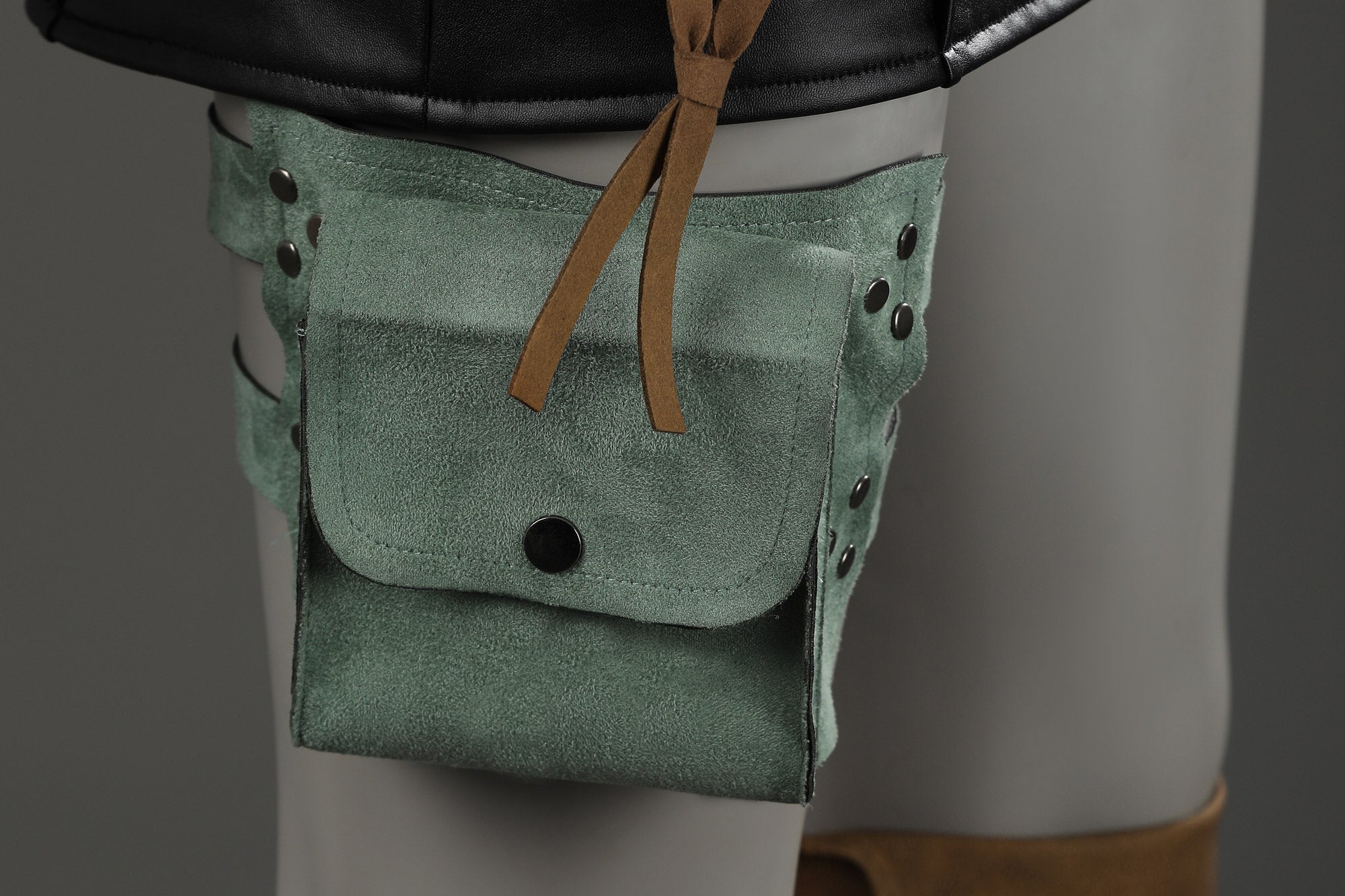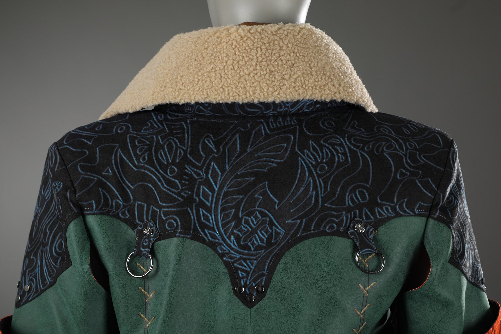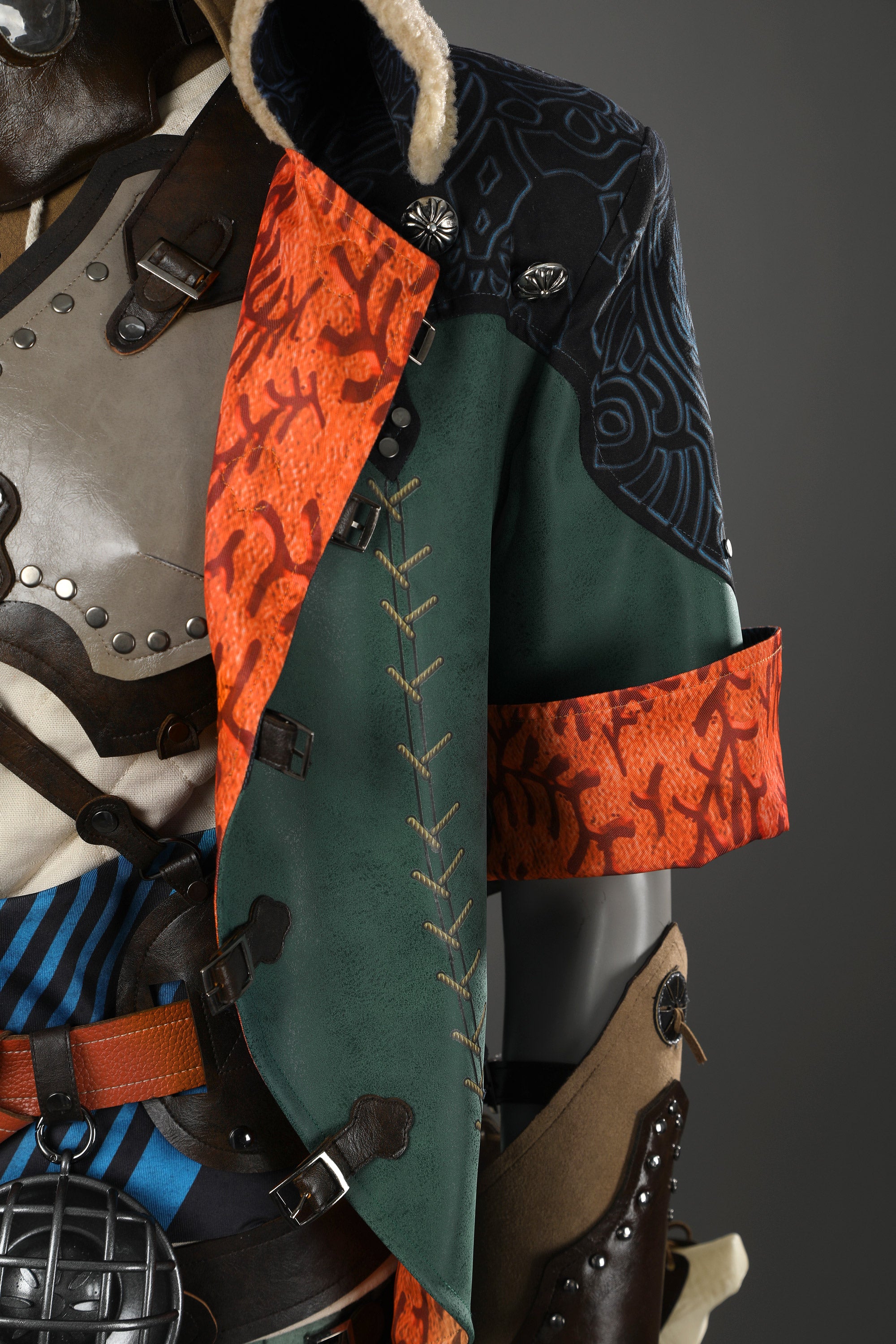 • Outer Coat: Durable faux leather with rustic detailing, highlighting a rugged, battle-ready style.