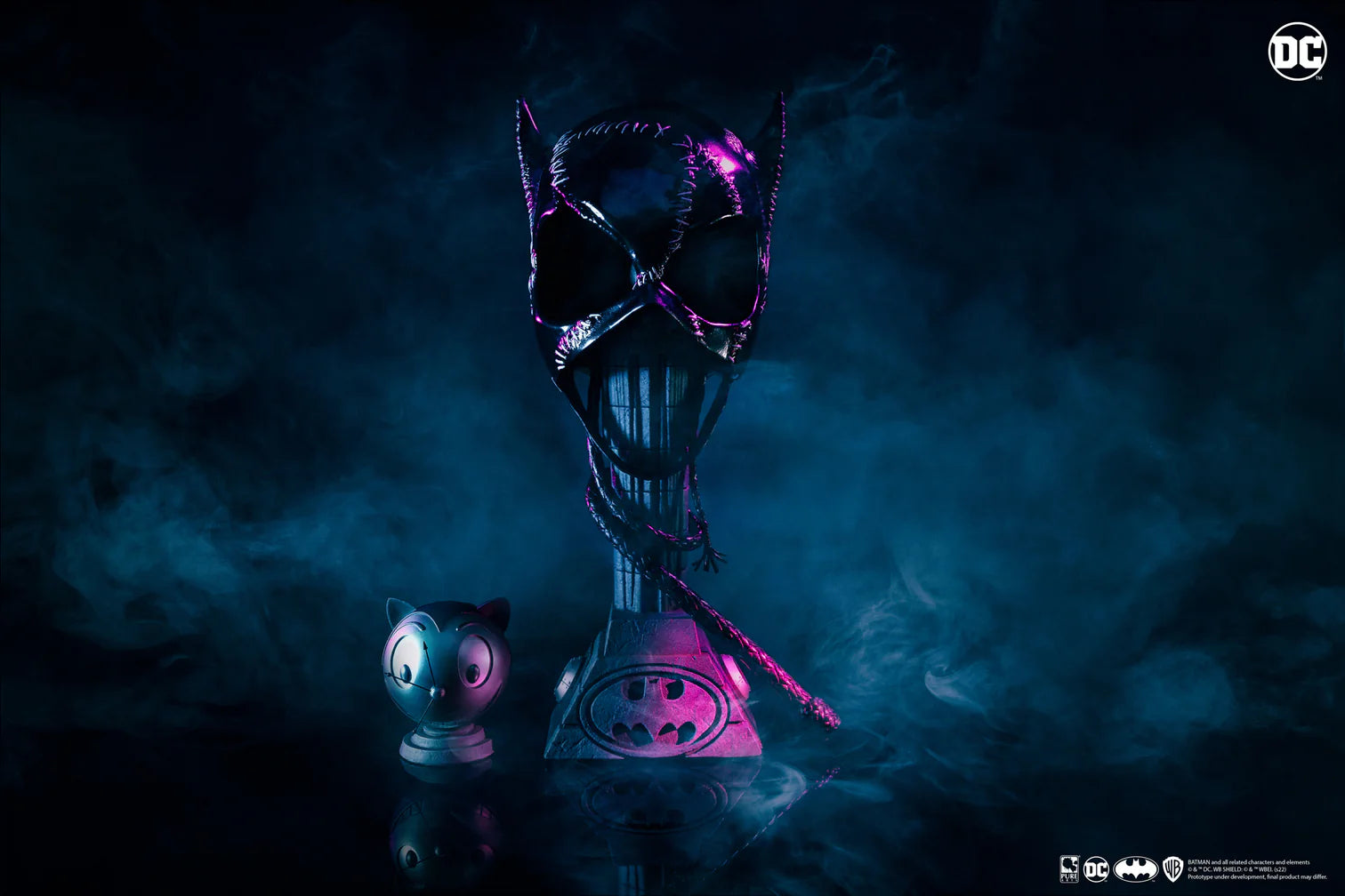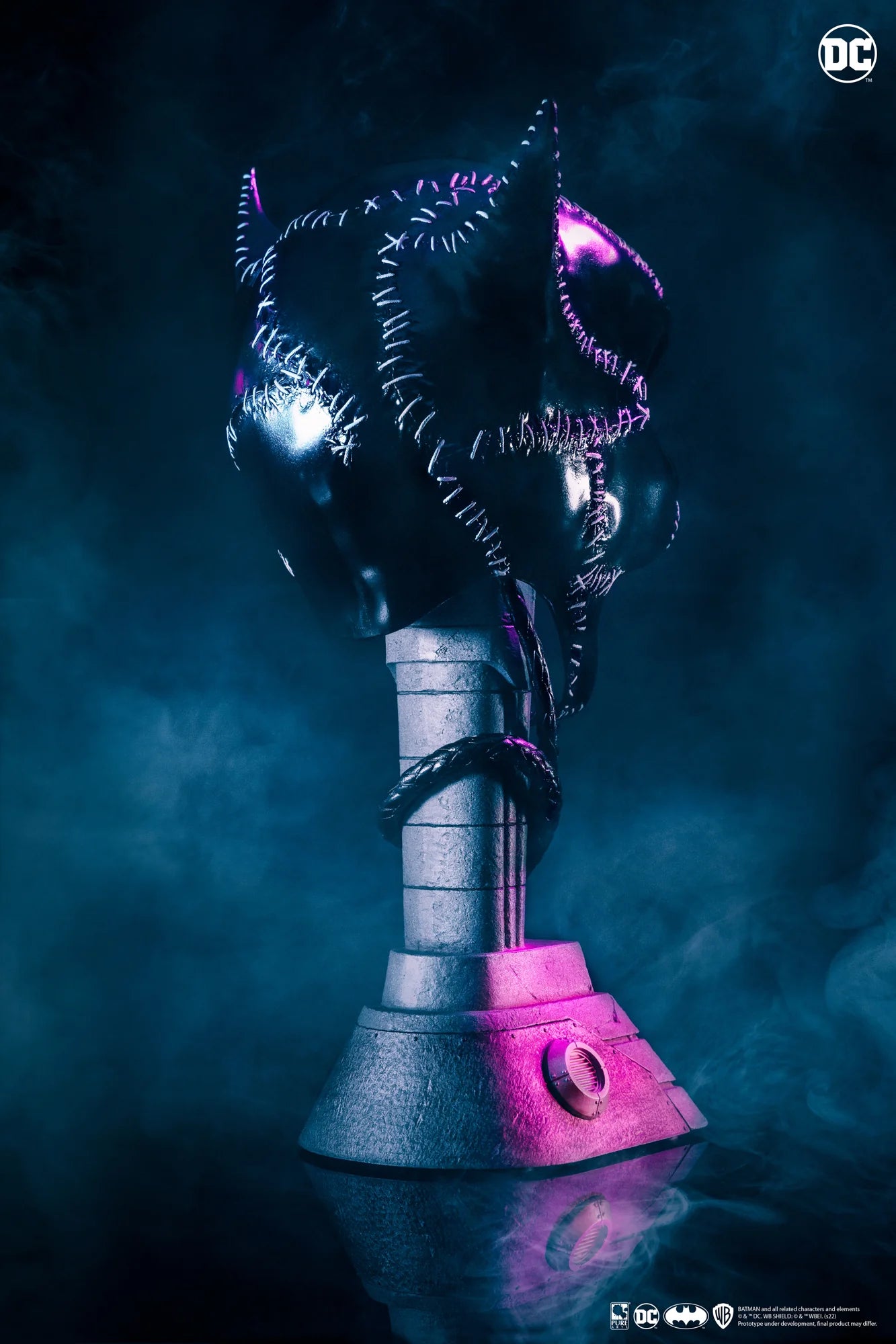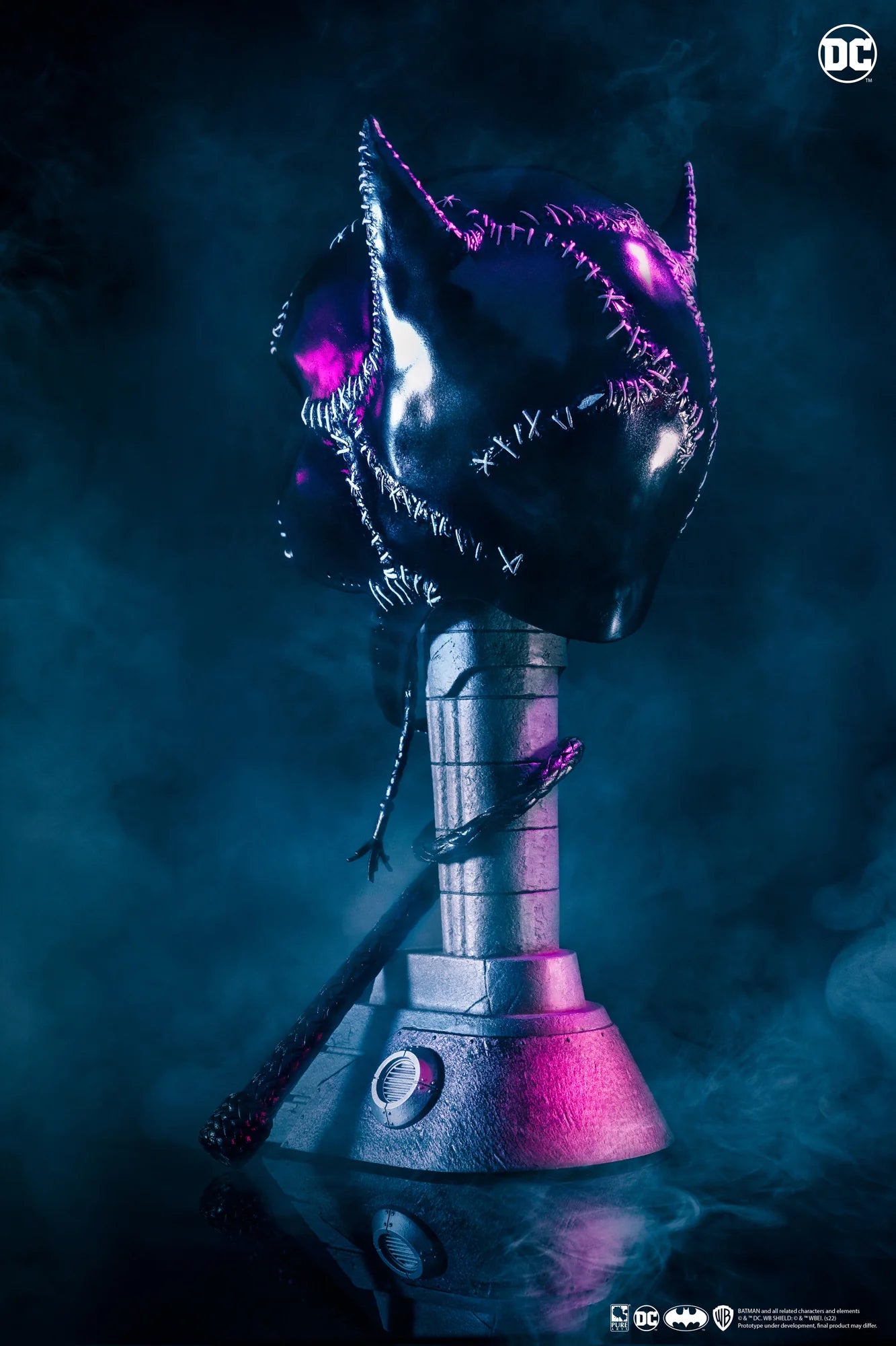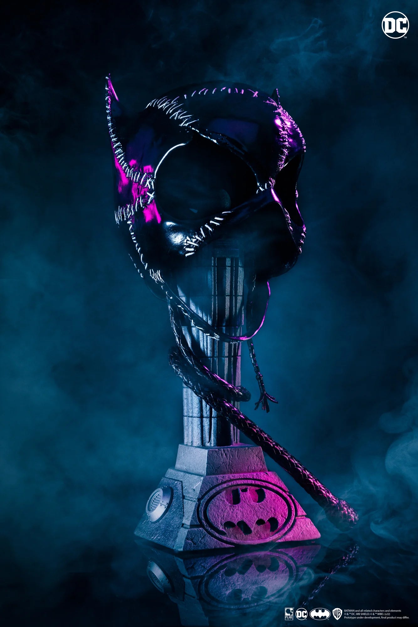 Celebrate the iconic performance of Michelle Pfeiffer as Catwoman with this breathtaking 1:1 Scale Mask Replica. From its hyper-realistic high-gloss finish to the authentic white threading details, this mask is a perfect tribute to one of the most unforgettable characters from Batman Returns. The addition of the removable whip and Gotham Mayoral House base makes this piece a true centerpiece for any Batman or Catwoman fan’s collection.