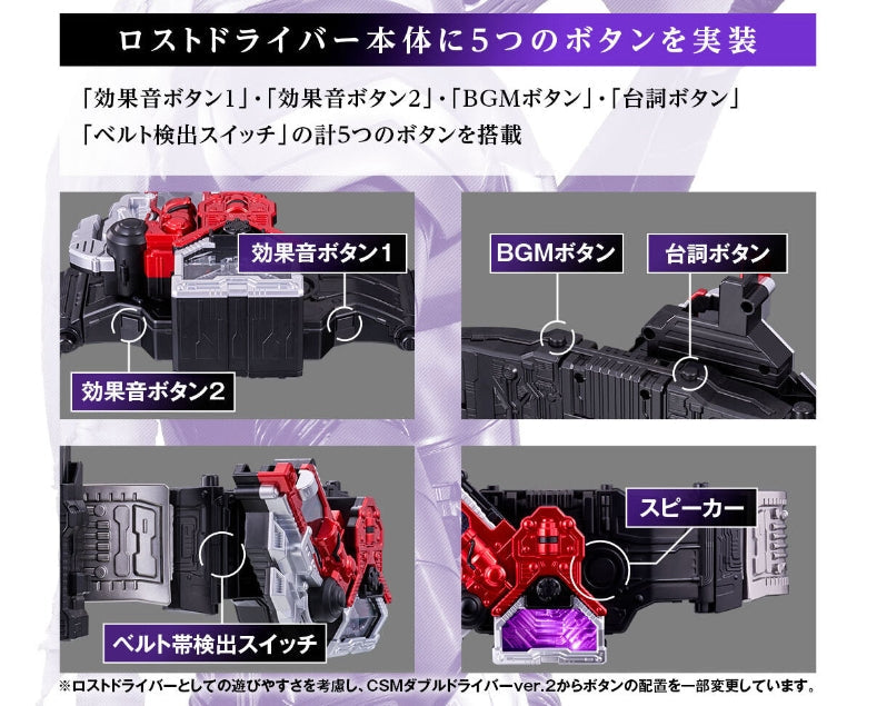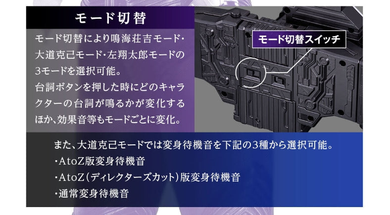 A built-in switch allows you to toggle the driver between Shotaro, Sokichi and Katsumi modes. Depending on the mode selected, the dialogue, BGM and SFX activated by the driver will change.