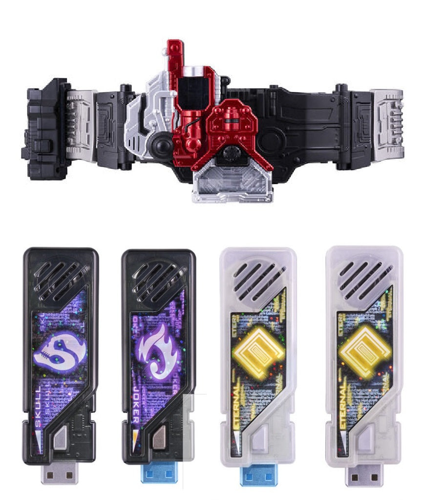 The set includes four Gaia Memories: Skull, Joker T2, Eternal T2 and Eternal which feature communication functions with the ver 2 drivers (both Lost and Double). The Joker memory released with the CSM Double Driver Ver 2 (sold separately) can be used to activate the henshin from episode 49 as well!