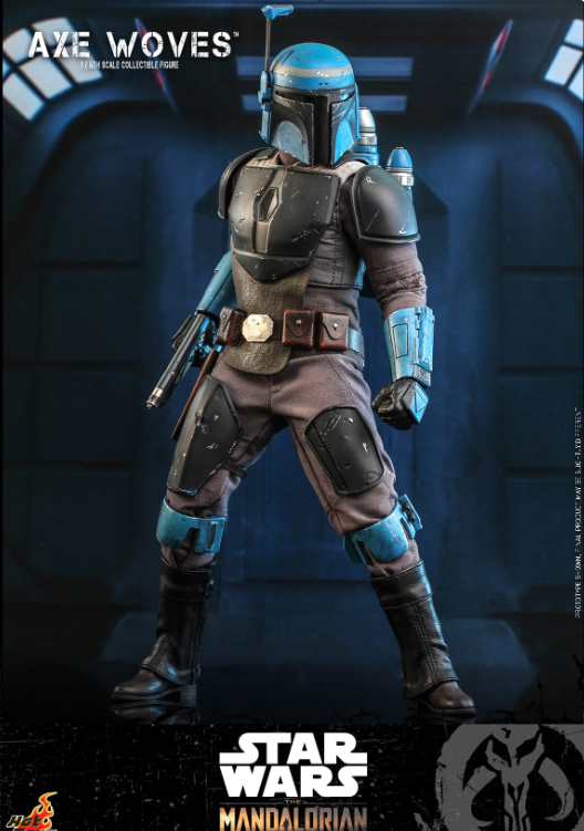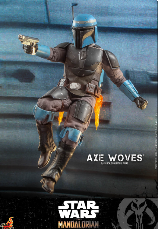 The Axe Woves™ collectible figure features a detailed Mandalorian helmet and armor with weathering effects, skillfully tailored under-suit, a jetpack with booster fire effects, a blaster pistol, a themed display stand!