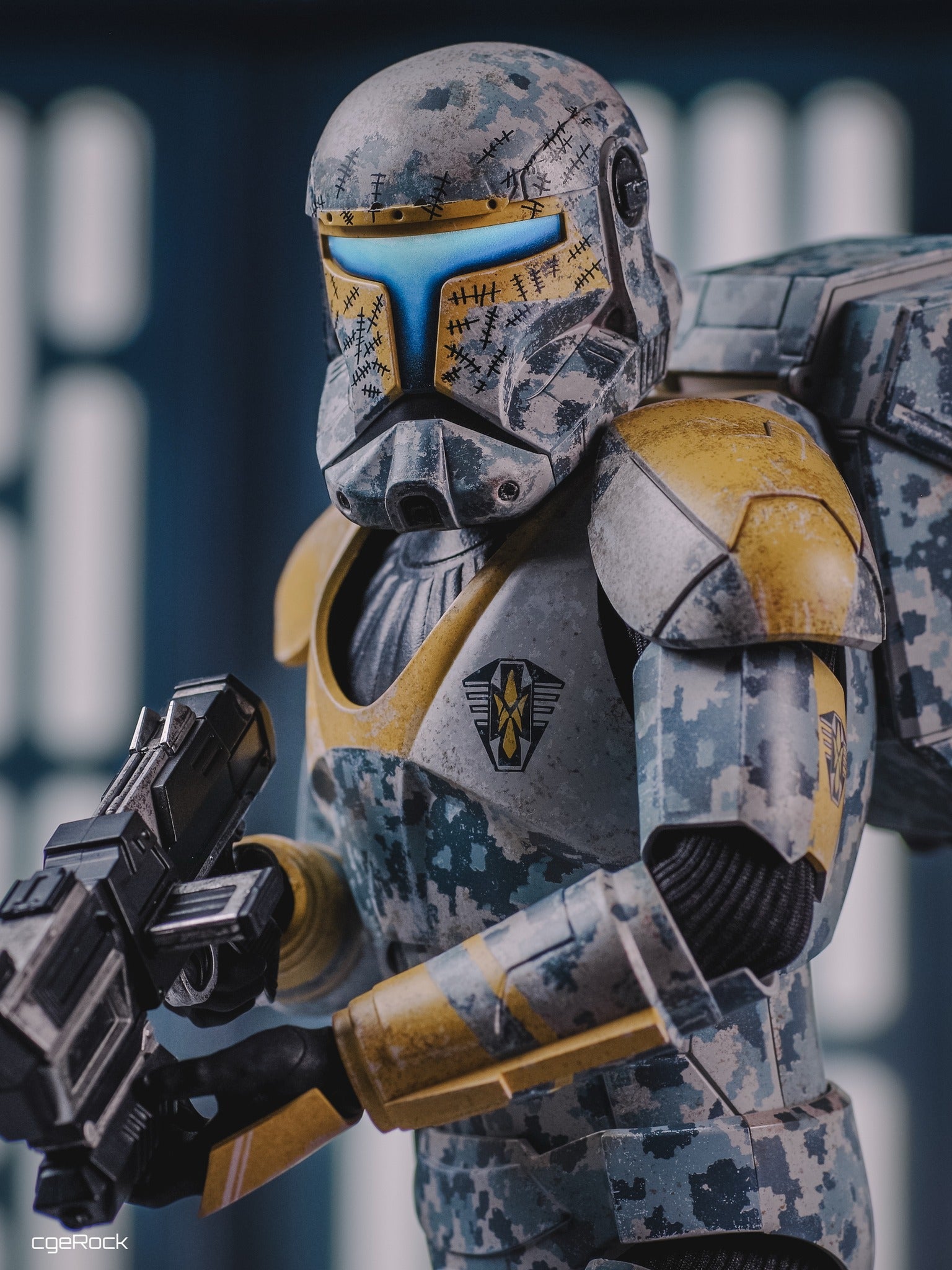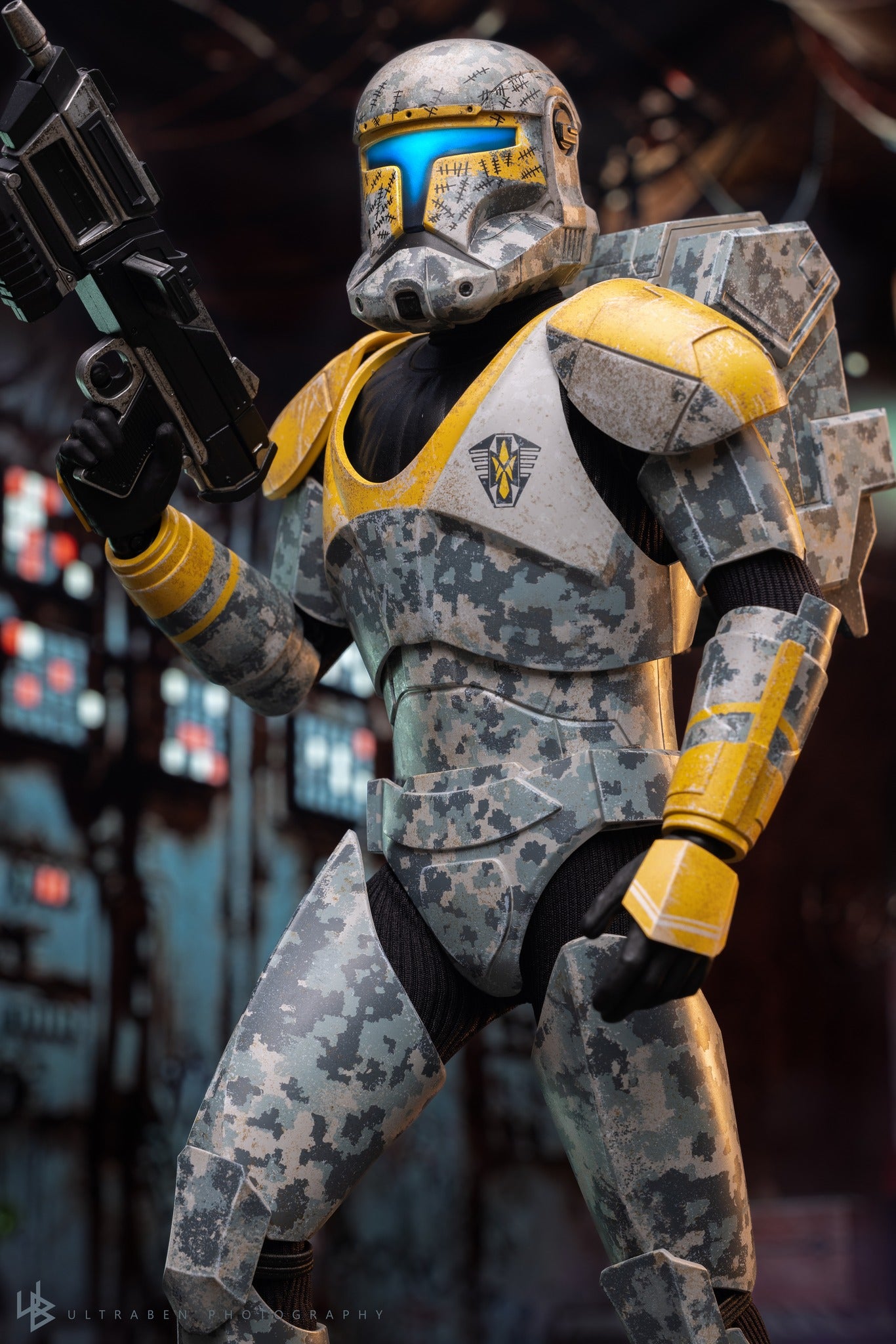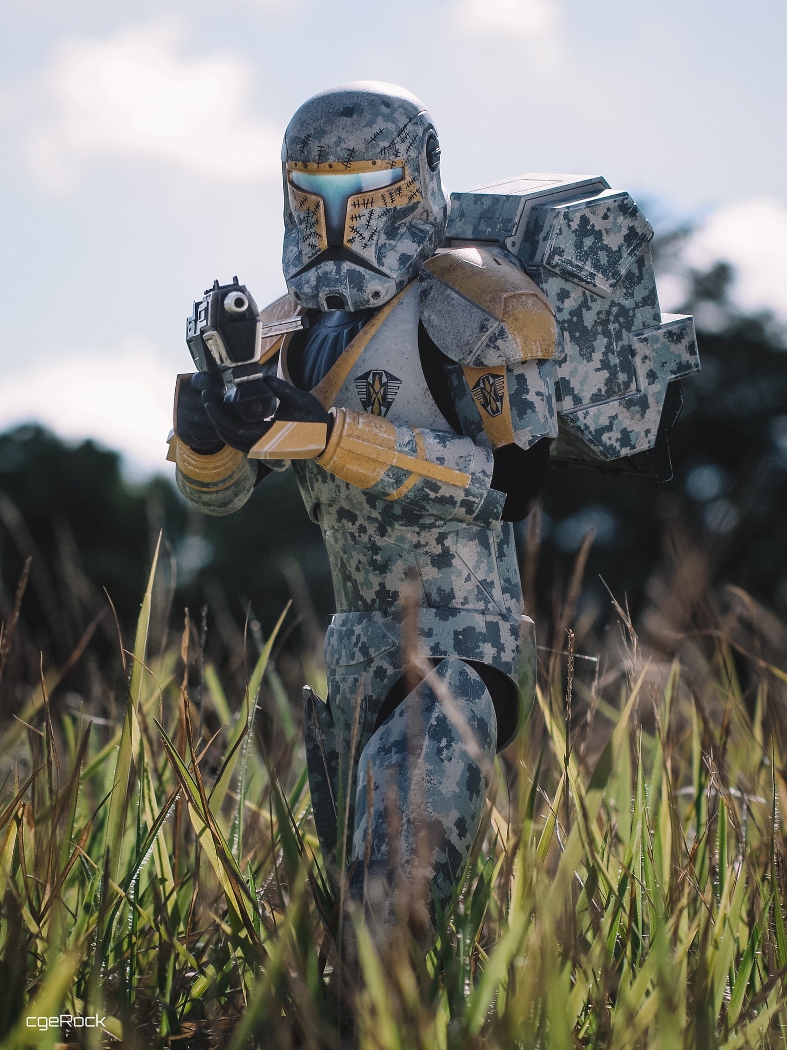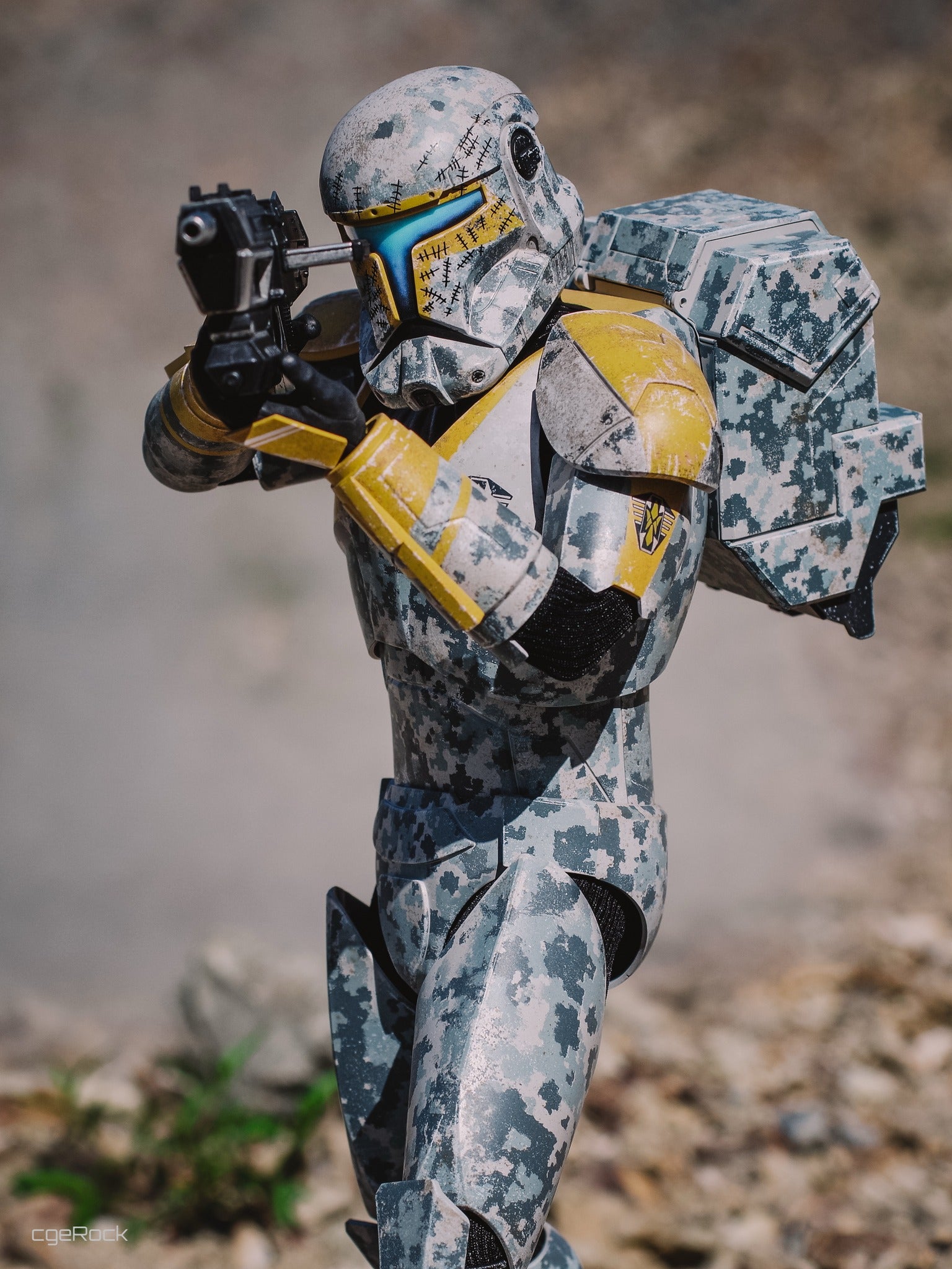 - One (1) finely crafted Clone Commando Gregor armor with yellow markings, gray camouflage details, and weathering effects