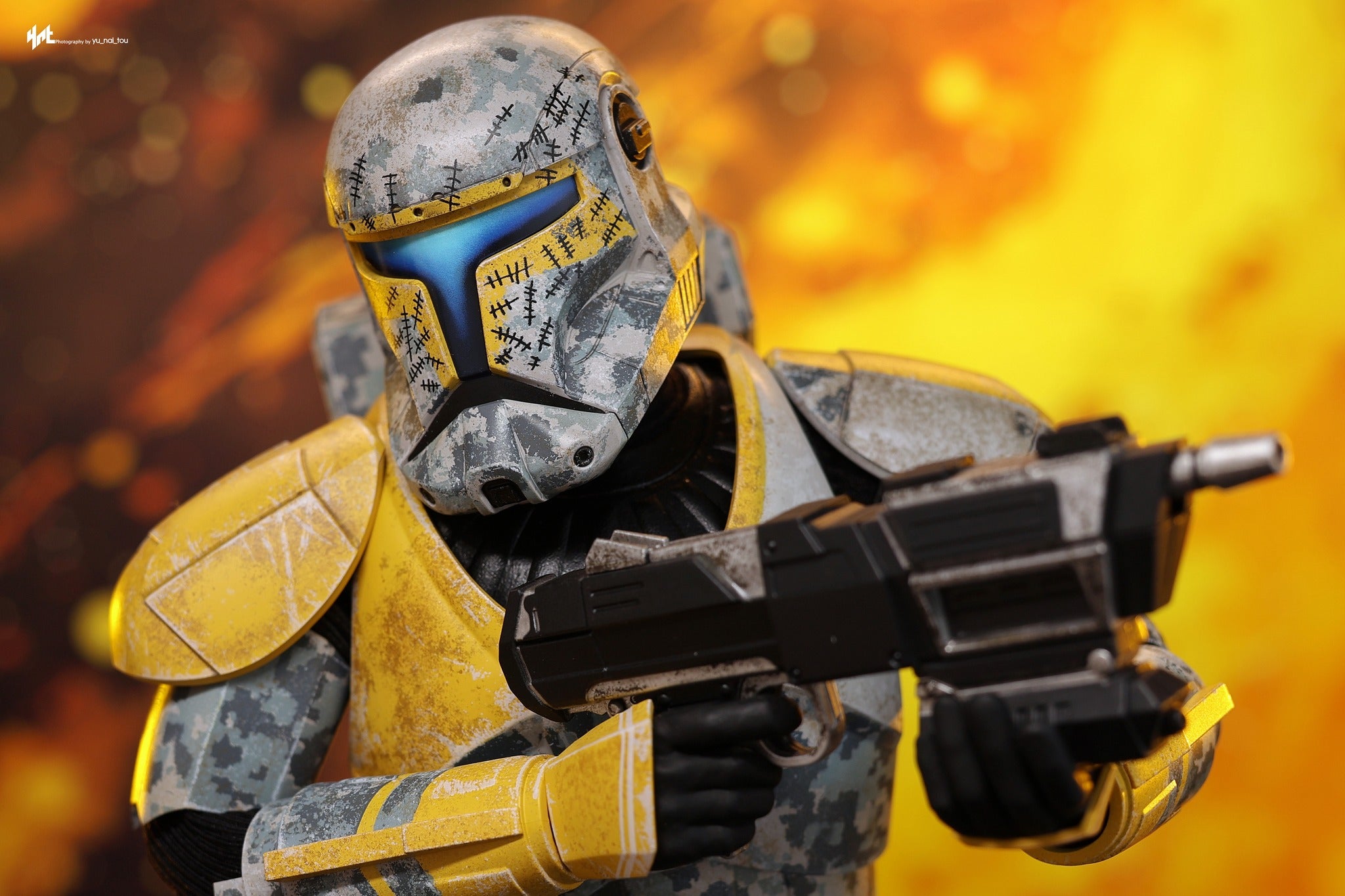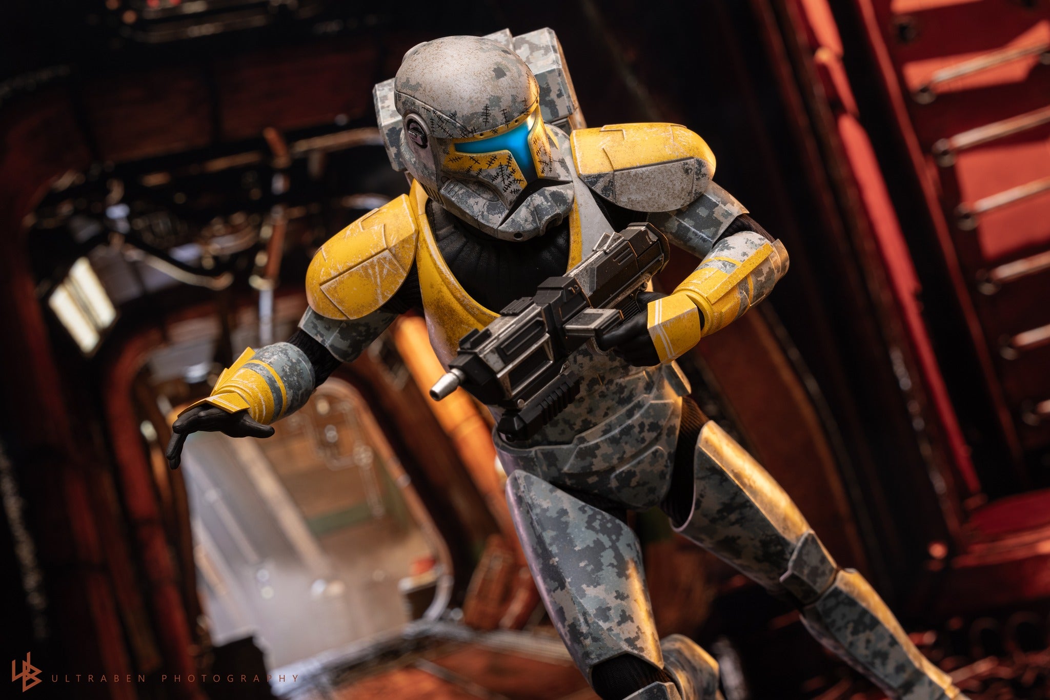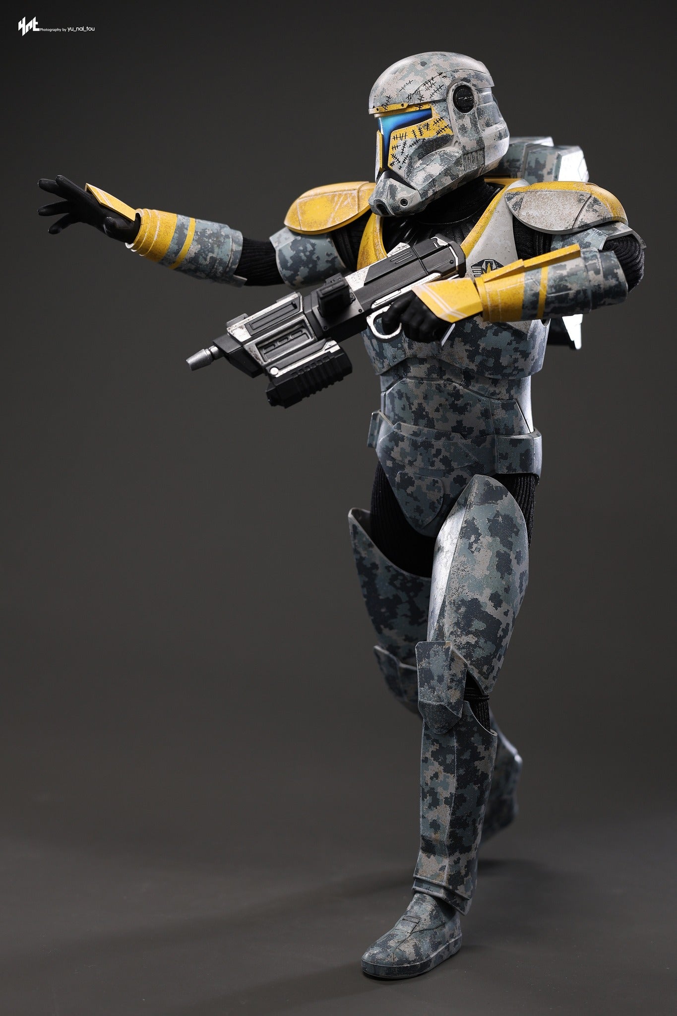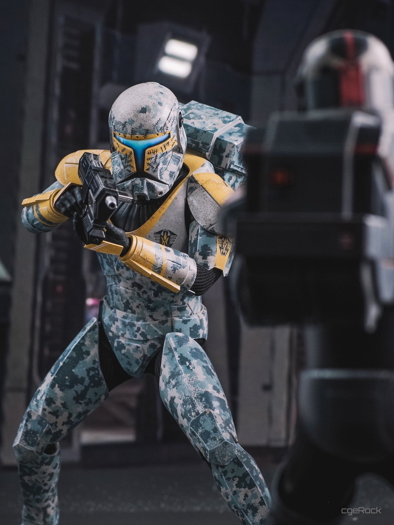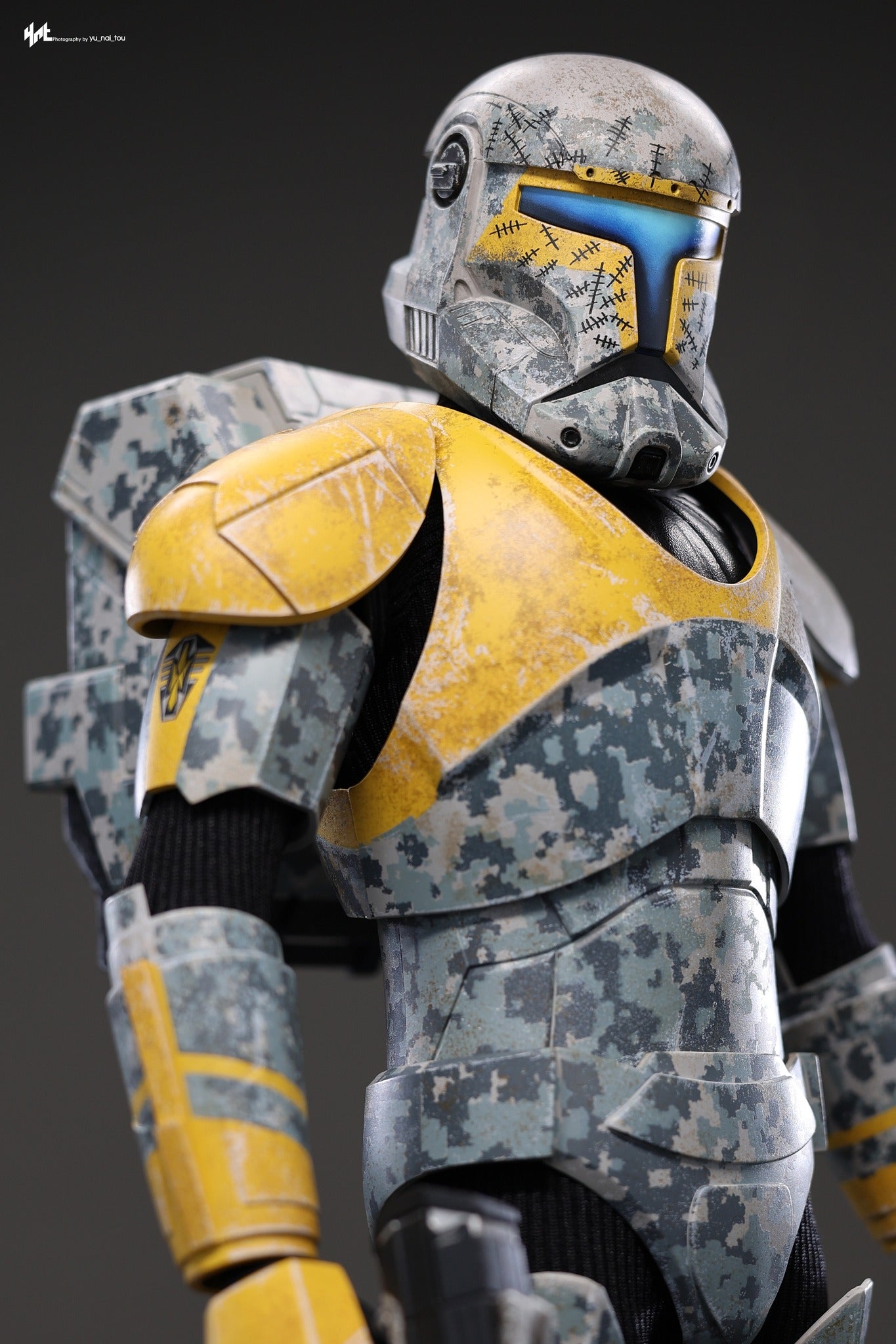 - One (1) finely crafted Clone Commando Gregor armor with yellow markings, gray camouflage details, and weathering effects