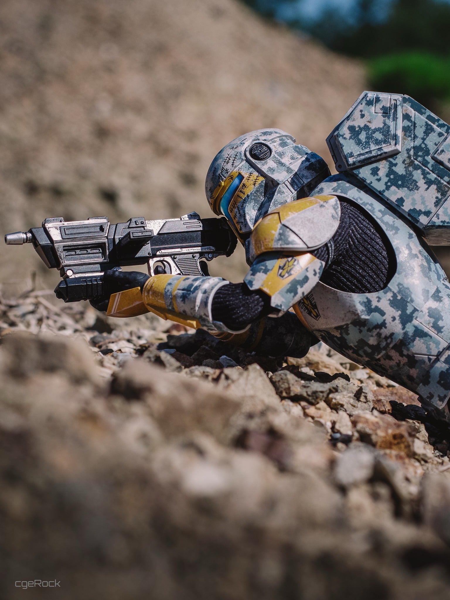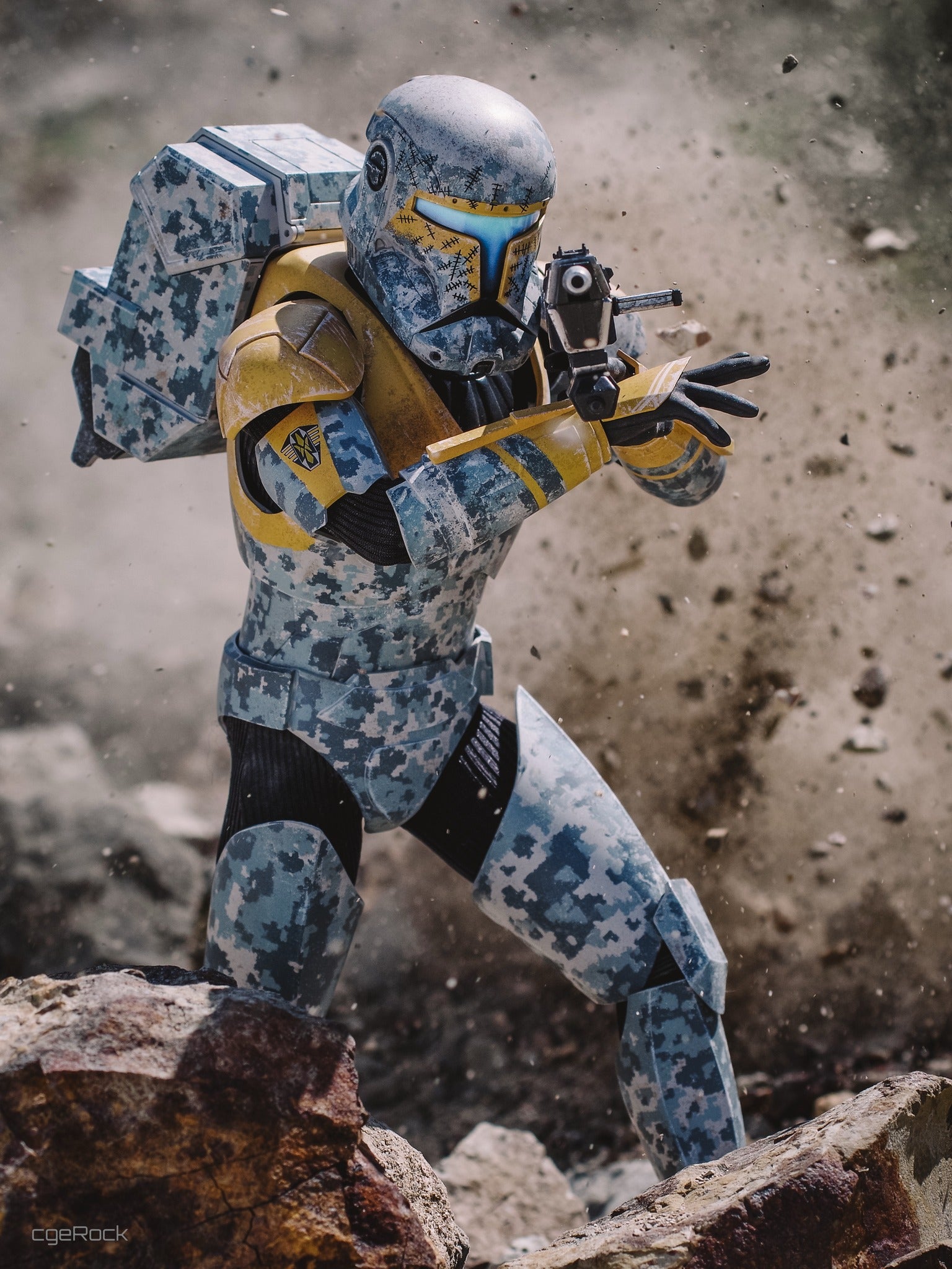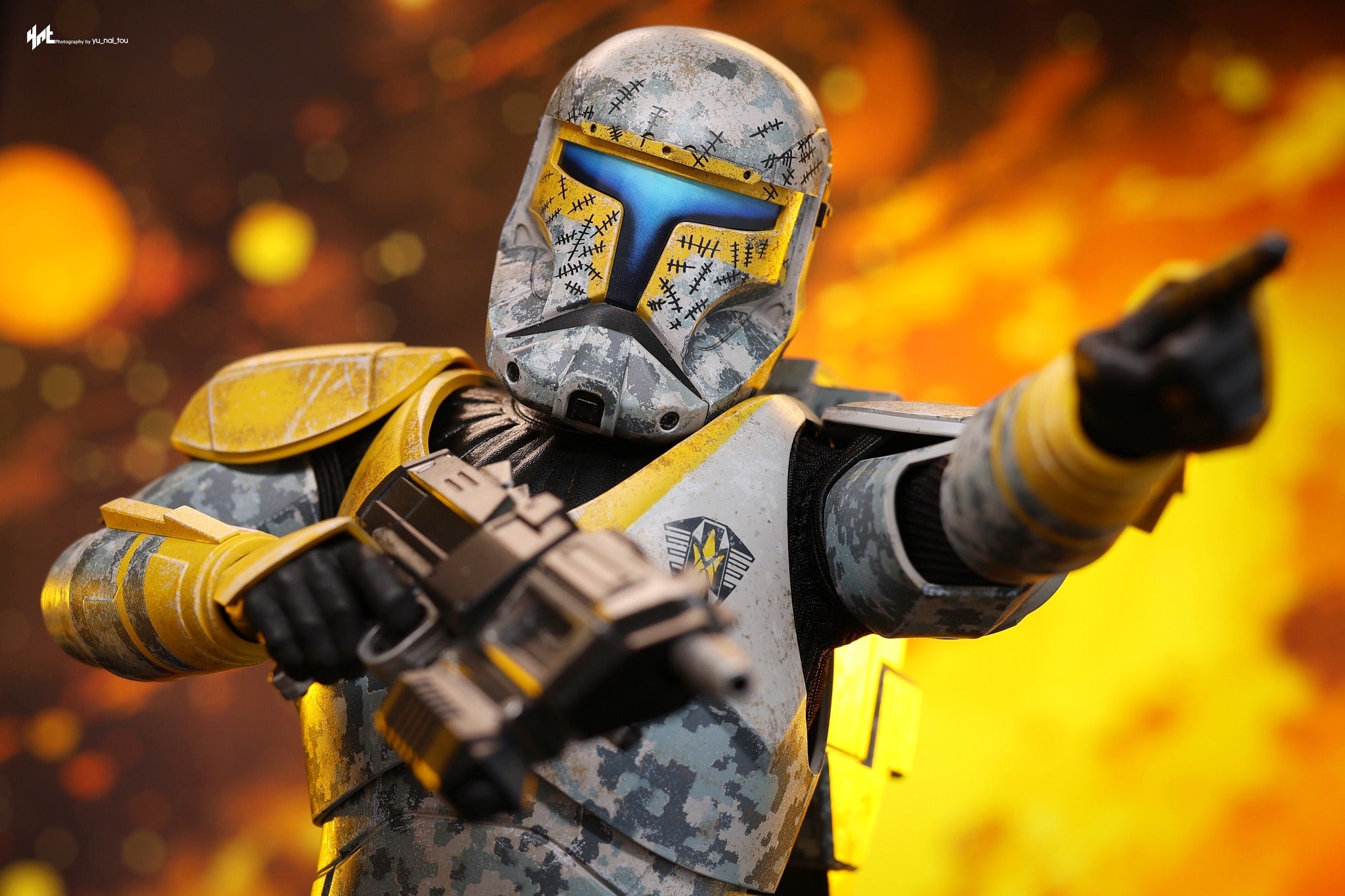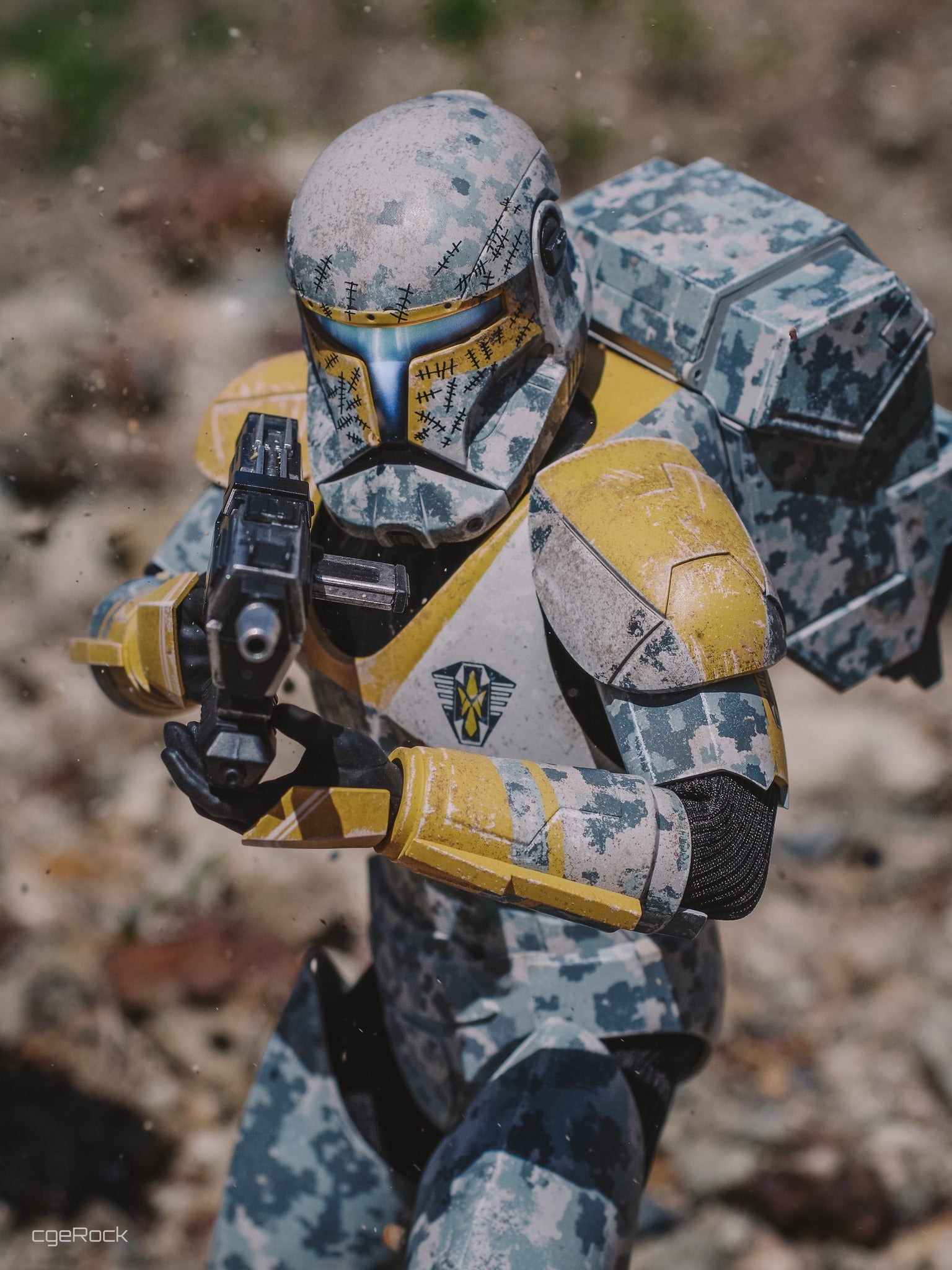 - One (1) finely crafted Clone Commando Gregor armor with yellow markings, gray camouflage details, and weathering effects