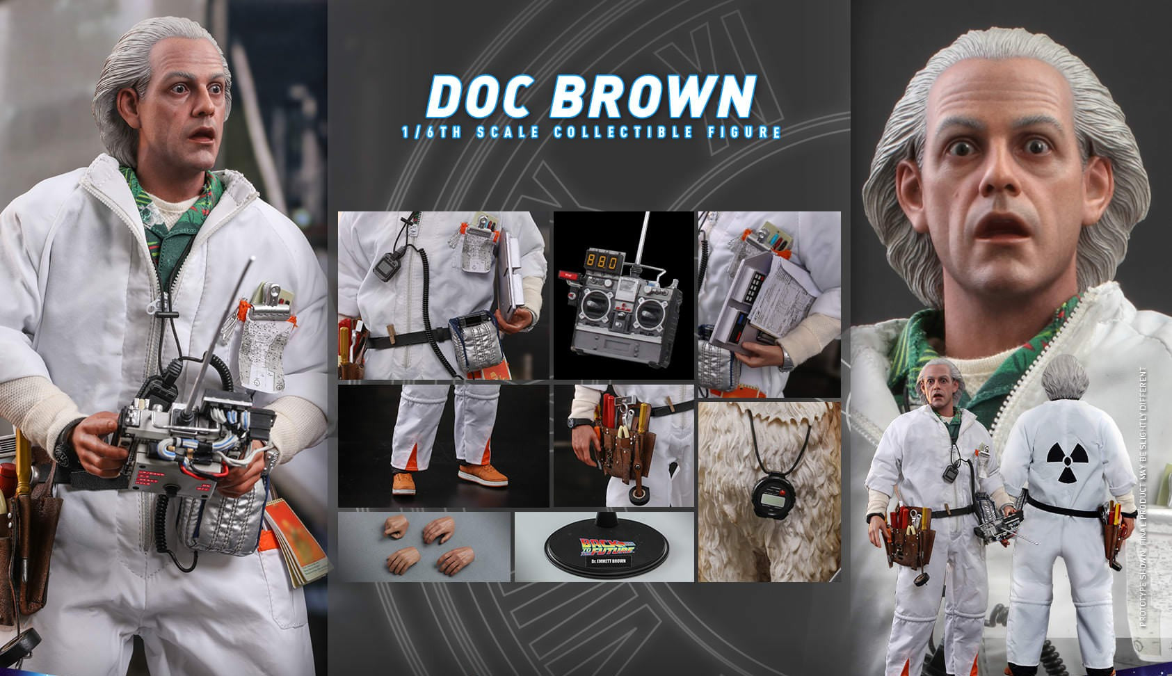 The 1/6th scale Doc Brown Collectible Figure (Deluxe Version) specially features: