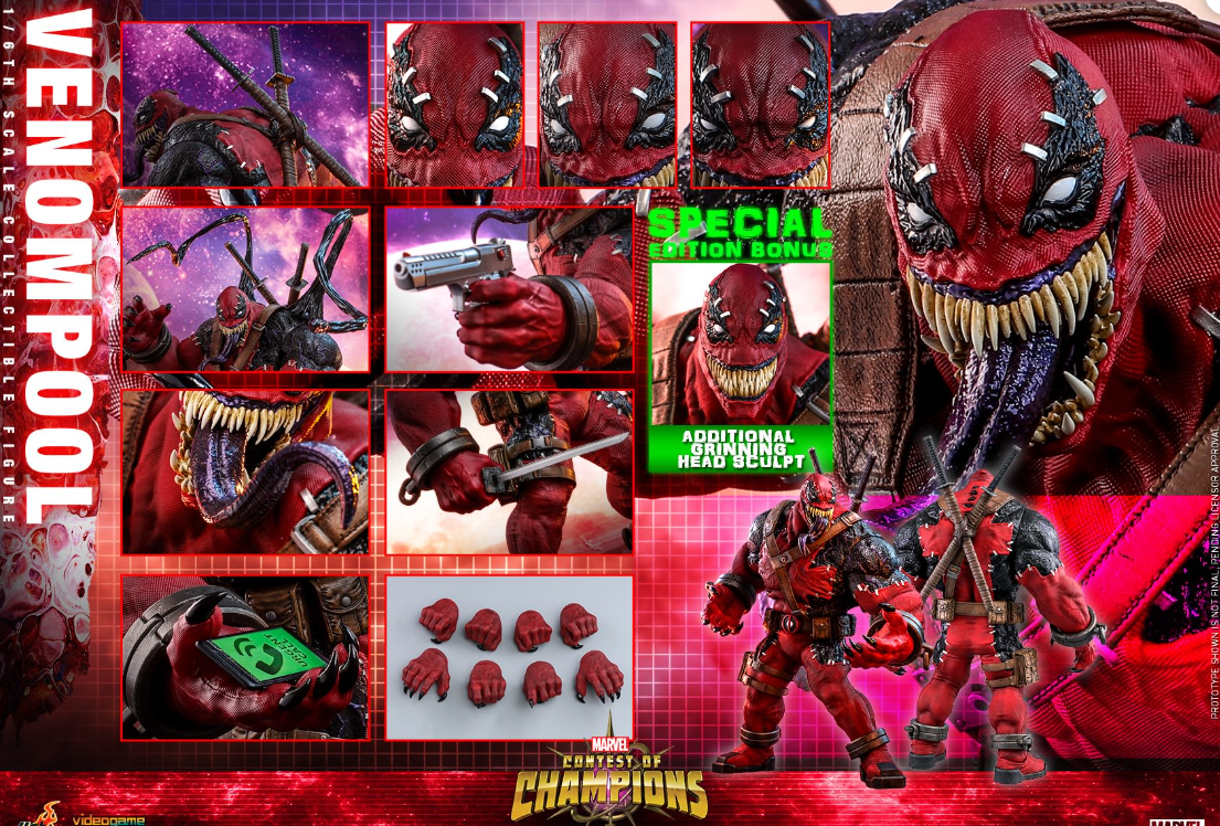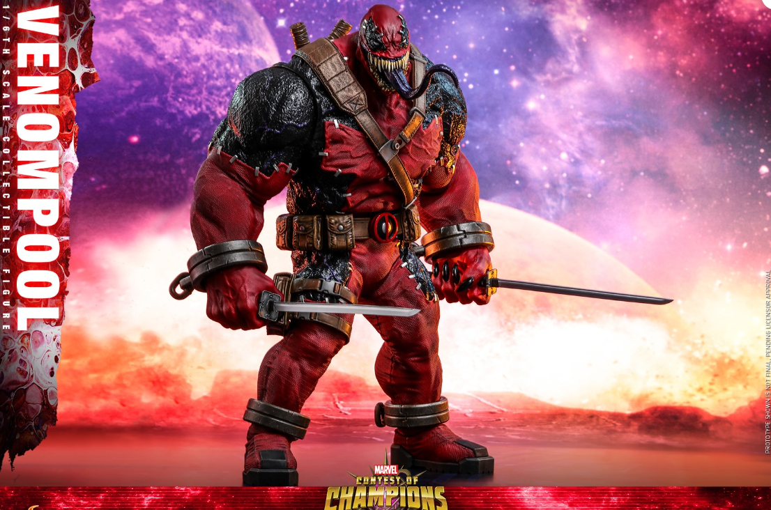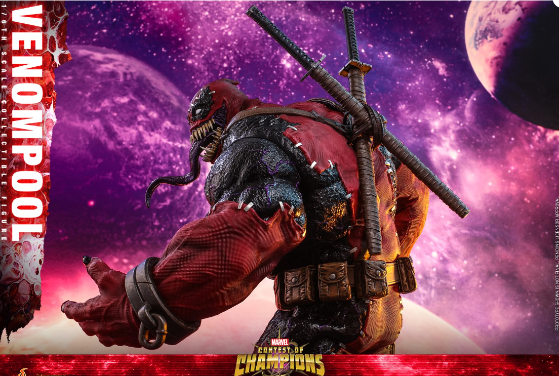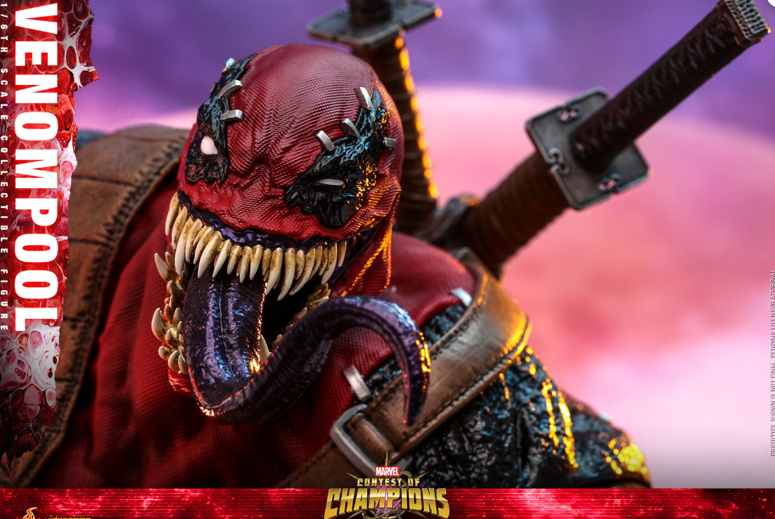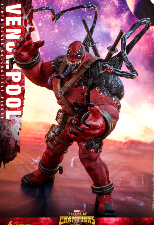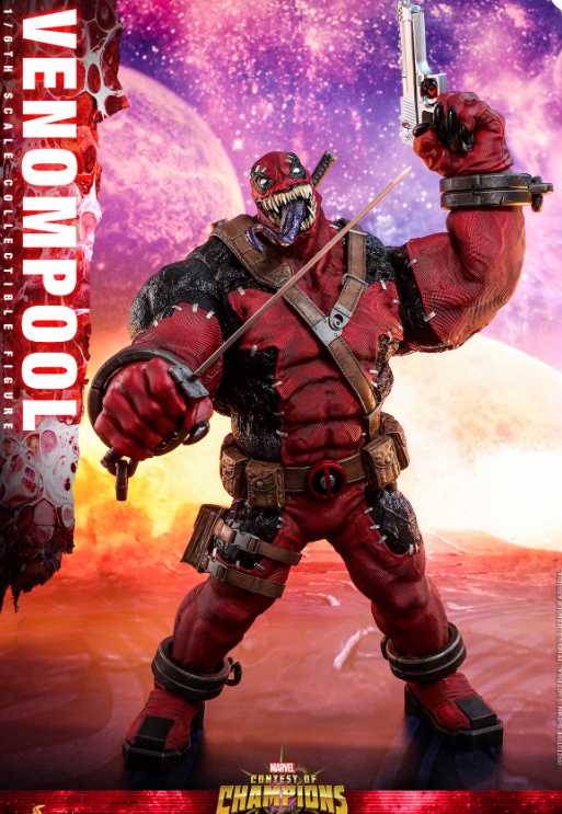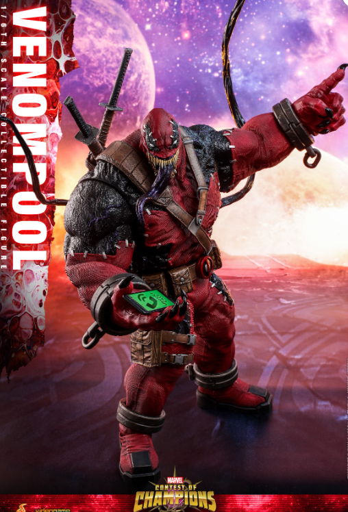 As one of the most popular and bizarre elements of the Marvel Universe, the Venom symbiote can possess people and give them powers in the process. This alien entity can shift from host to host and has managed to become entangled with characters! So what if Venom symbiote possessed Deadpool? Today, Hot Toys is very excited to bring to you the brand new 1/6th scale collectible figure that captures the wildly popular character – Venompool from an impressive lineup of Marvel Contest of Champions!