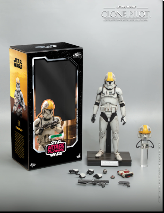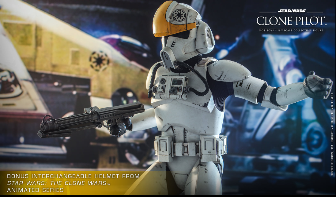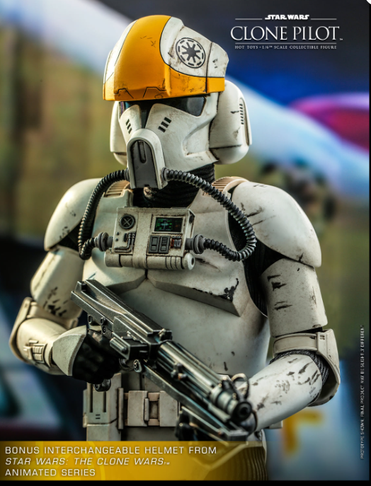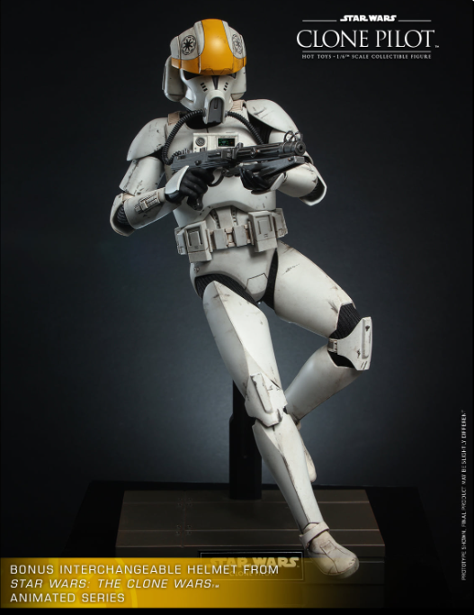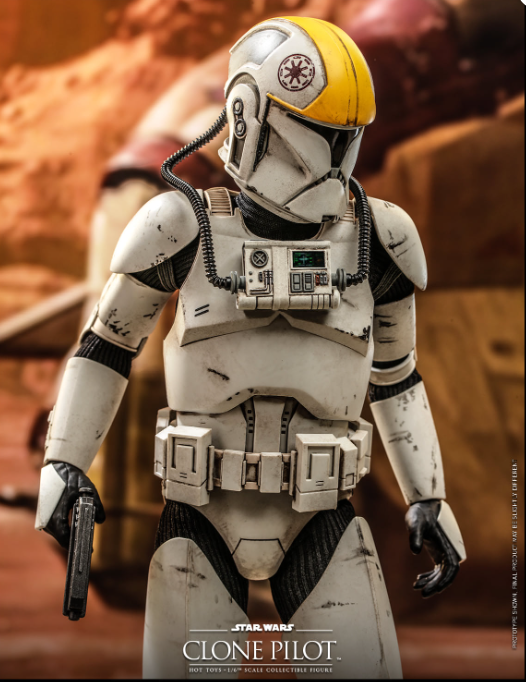 The new 1/6th scale Clone Pilot collectible figure features a specialized Clone Pilot helmet, an interchangeable Clone Pilot helmet, a detailed armor with weathering effects, two styles of blasters, a pair of binoculars, thermal detonators, and a figure base!