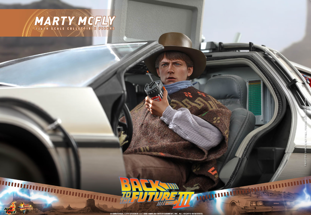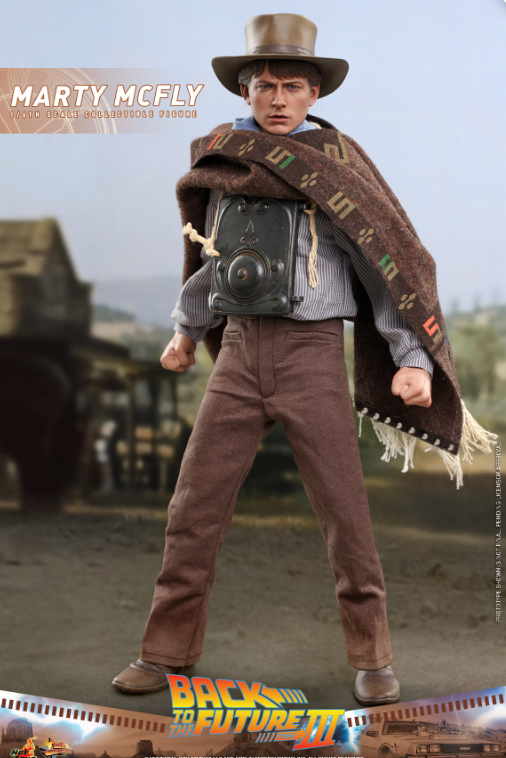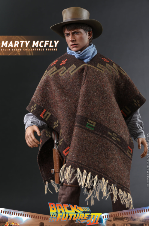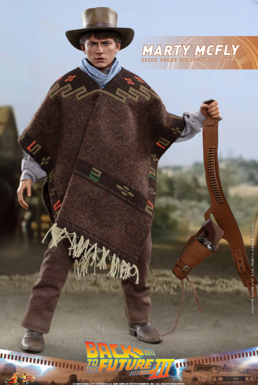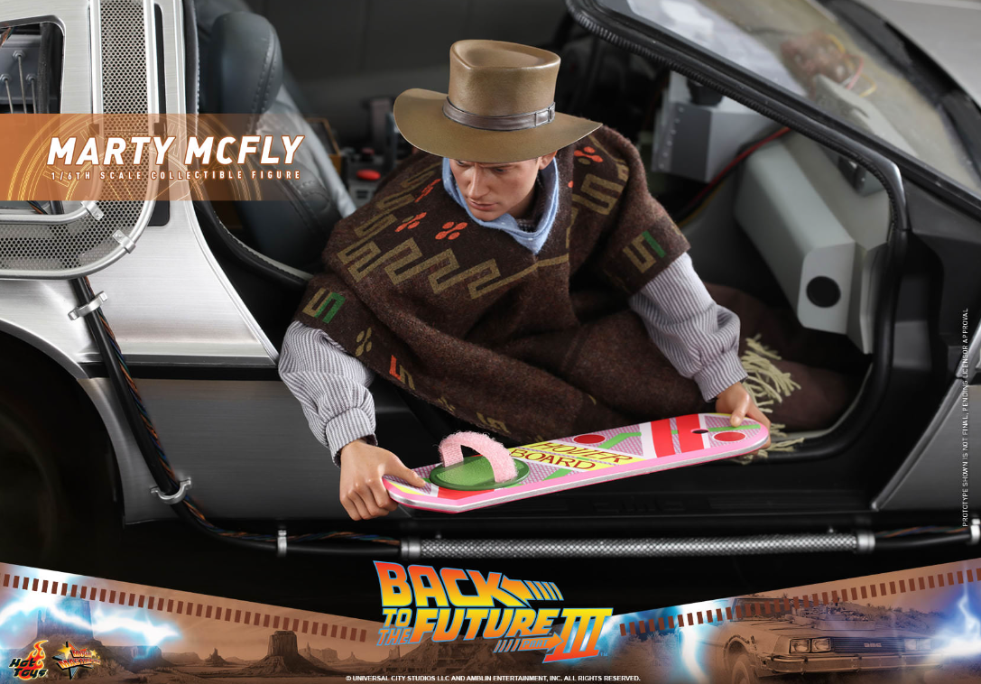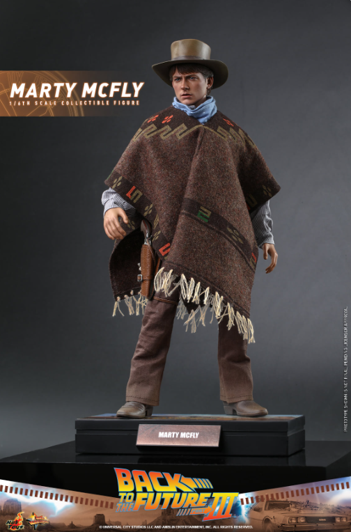 The stunningly detailed collectible figure is specially crafted based on the appearance of Michael J. Fox as Marty McFly in Back to the Future III, featuring a newly developed head sculpt and cowboy hat with amazing likeness, screen accurate costume, a brown patterned poncho, cowboy scarf, an array of weapon and accessories including pistol, bullet proof stove plate, pie dish, framed photo from Doc Brown, photo of Doc’s tomb, communicator with battery, hoverboard and a figure stand!