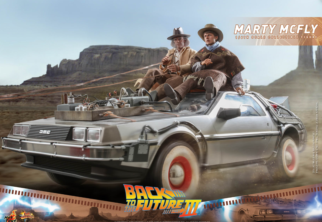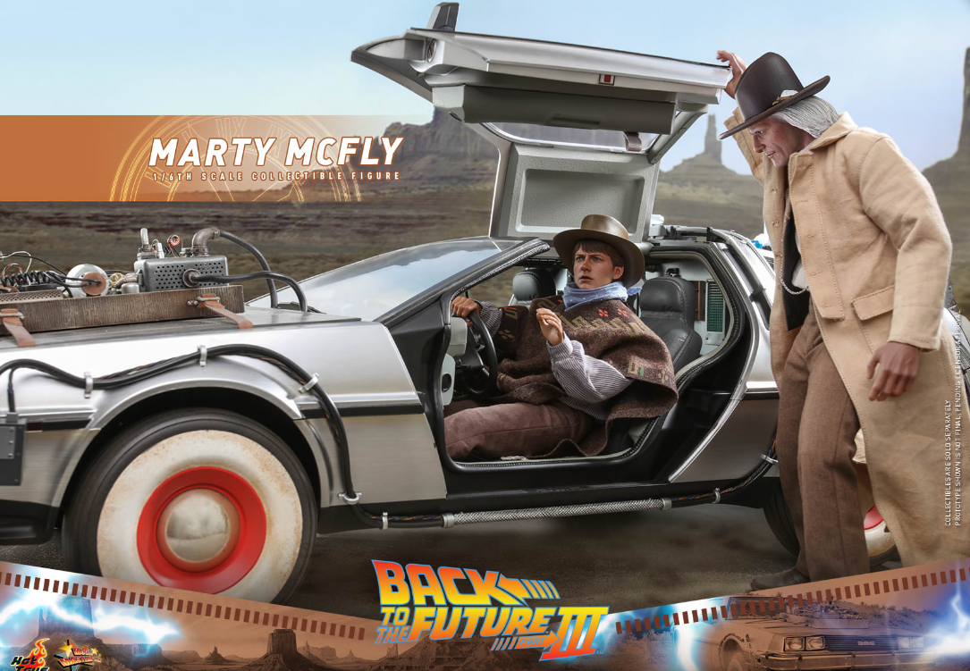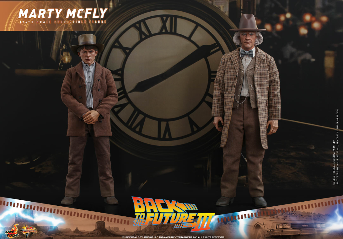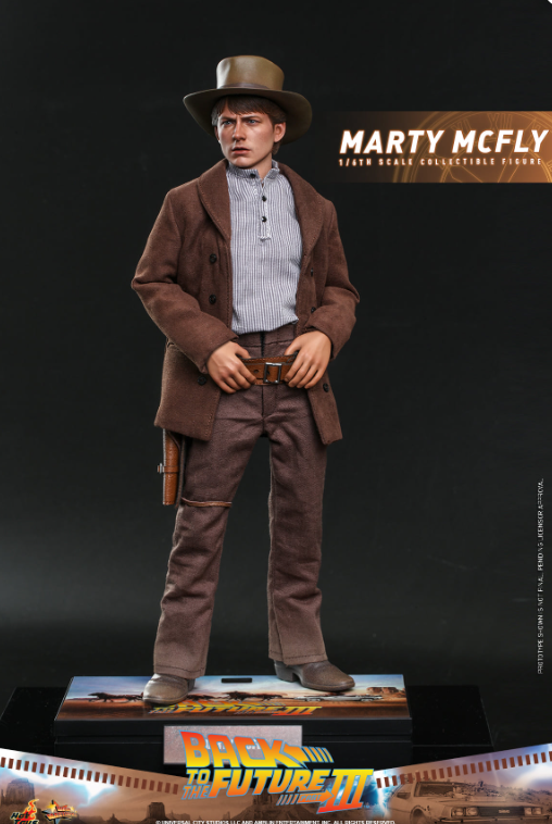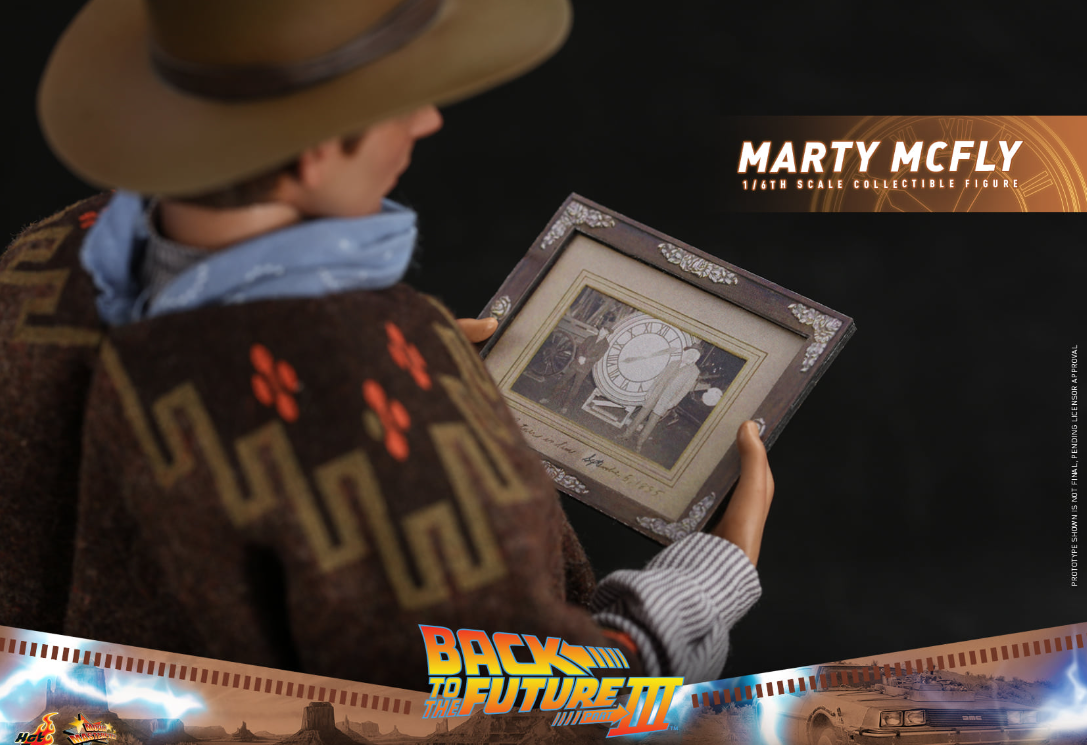 The stunningly detailed collectible figure is specially crafted based on the appearance of Michael J. Fox as Marty McFly in Back to the Future III, featuring a newly developed head sculpt and cowboy hat with amazing likeness, screen accurate costume, a brown patterned poncho, cowboy scarf, an array of weapon and accessories including pistol, bullet proof stove plate, pie dish, framed photo from Doc Brown, photo of Doc’s tomb, communicator with battery, hoverboard and a figure stand!