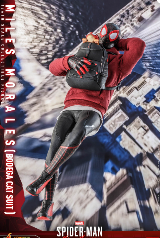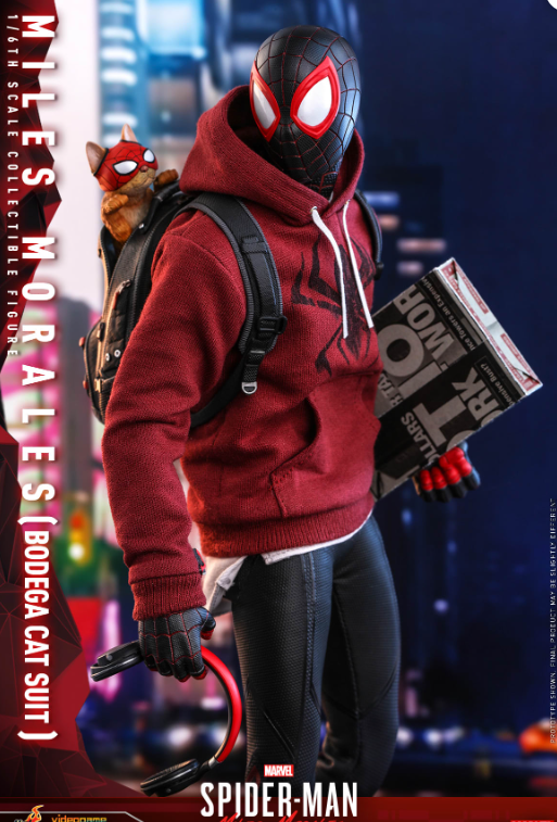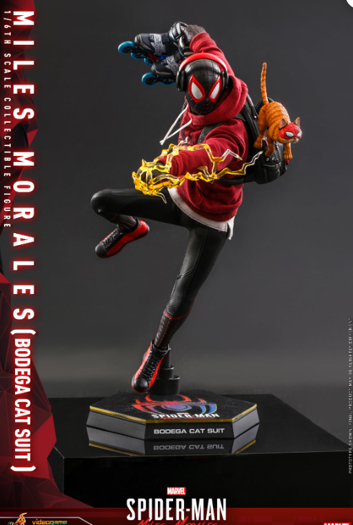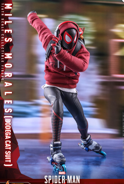 The highly accurate figure is crafted based on the appearance of Miles Morales in Bodega Cat Suit in the video game, features a newly crafted masked head and multiple interchangeable eye pieces for different expressions; a highly poseable body; finely tailored outfit including hoodie with an upside down black Spider emblem, a pair of inline skates and sneakers; Spider-Cat in running and hanging modes; an array of detailed accessories including backpack, headset, coffee cup, smart phone, sketchbook, gift box, Venom blast effect accessories, assorted spider-web effect accessories, matching interchangeable hands and dynamic figure stand for display.