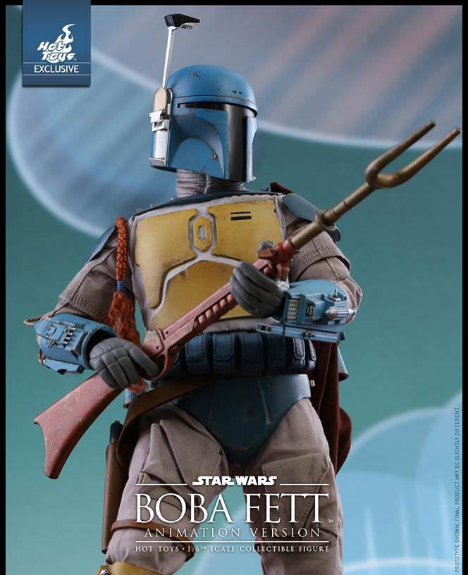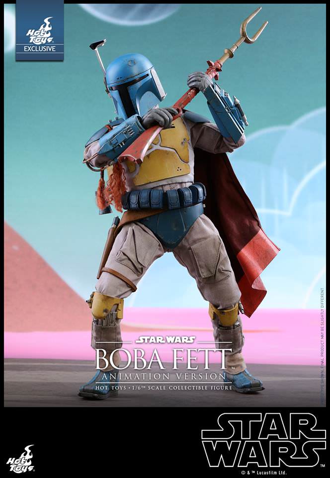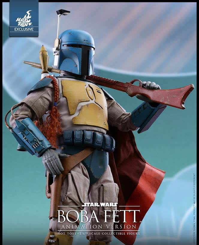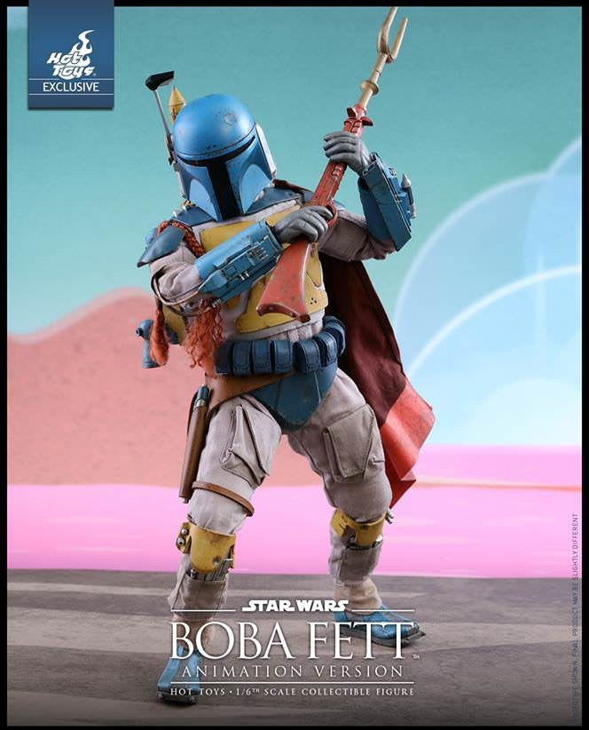 The 1/6th scale Boba Fett (Animation Version) figure is specially equipped with blue and yellow colored Mandolorian armor, a twin-pronged electropole, a blaster pistol and his iconic jetpack on his back.