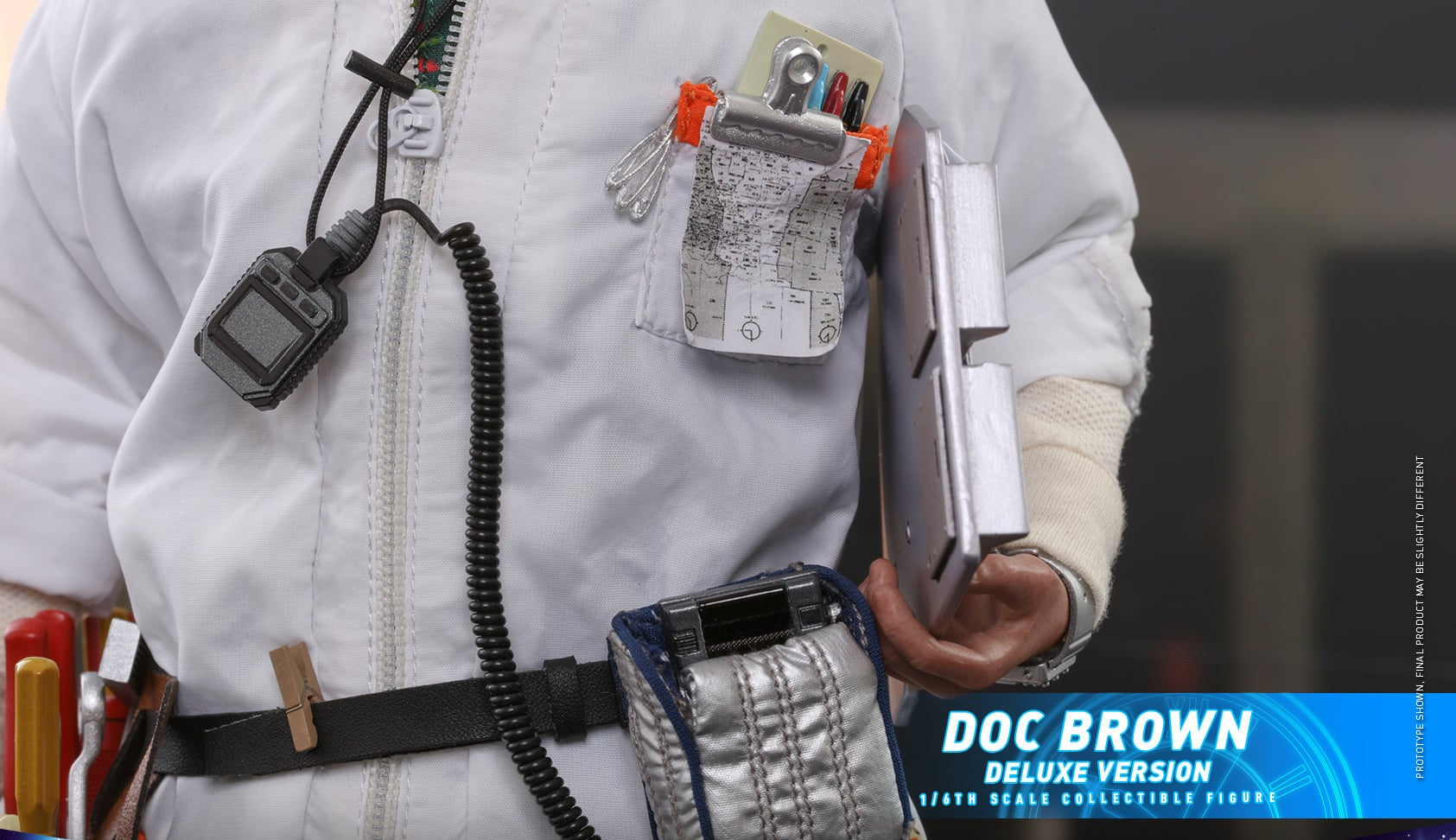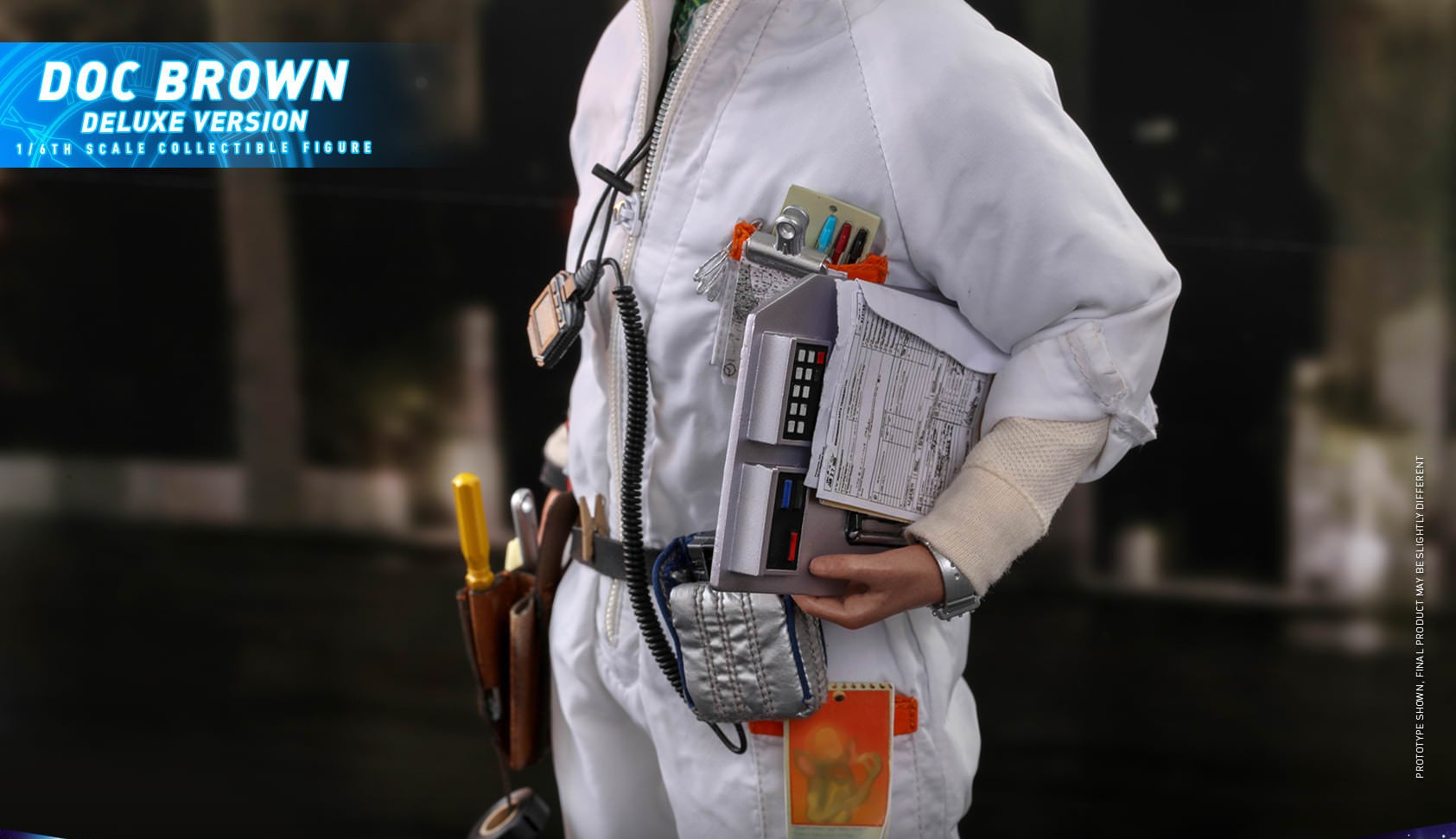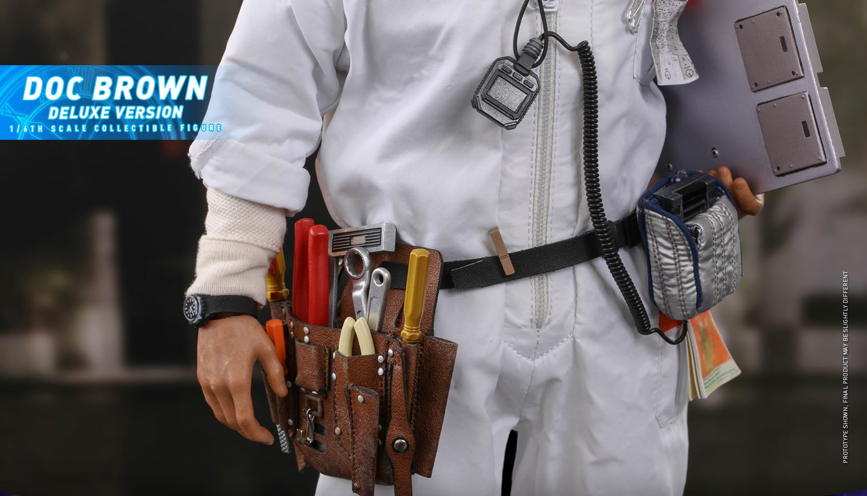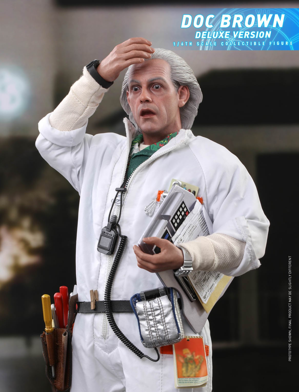 The 1/6th scale Doc Brown Collectible Figure (Deluxe Version) specially features: