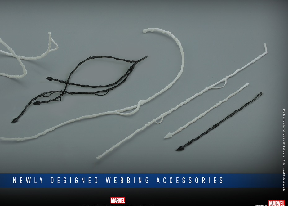 – One (1) black forearm web shooter with two (2) strings of black webbing accessories