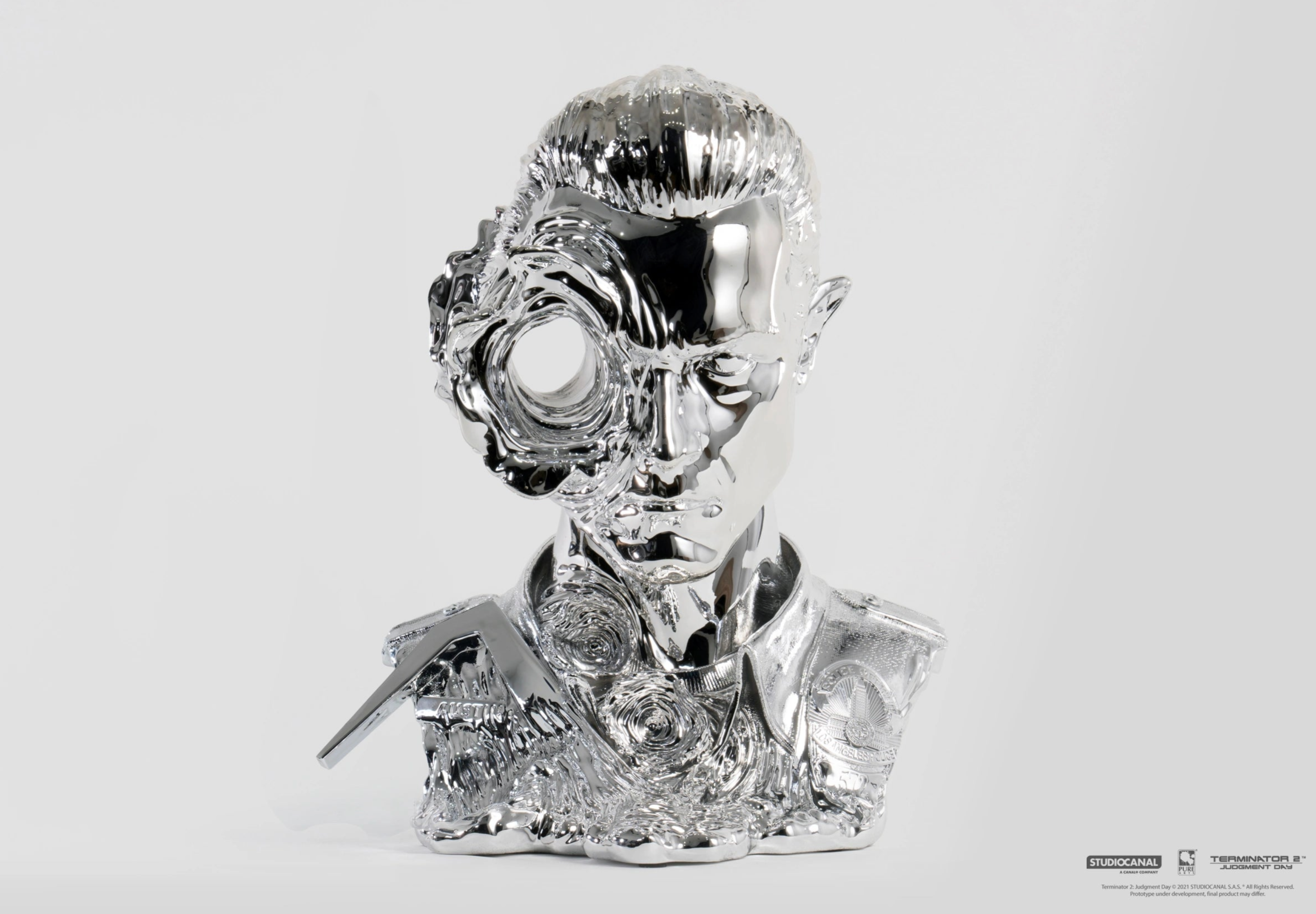 Celebrate the legacy of Terminator 2: Judgment Day with this breathtaking T-1000 Art Mask 1:1 Scale Replica. Featuring a bloody stabbing hand accessory in the Deluxe Edition, electro-plated chrome detailing, and versatile display options, this masterpiece is the perfect addition to any collection.